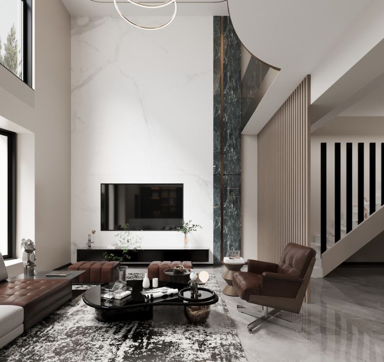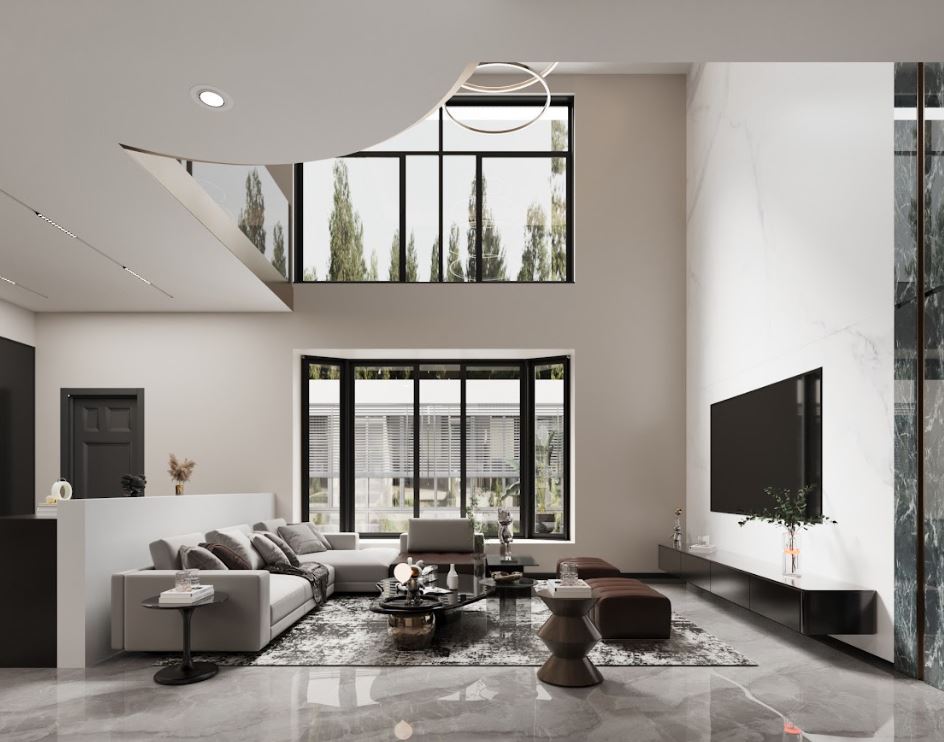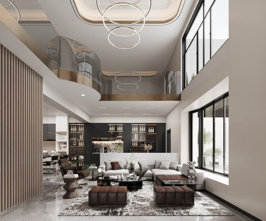 案例:一棟300平方公尺的豪宅,採用高挑設計,搭配大型落地窗和極簡吊燈。