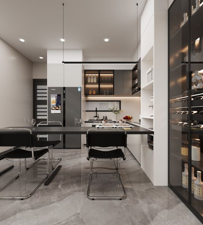 例:一間現代風廚房中加入黑色金屬燈具與原木餐桌,呈現與工業風的融合。