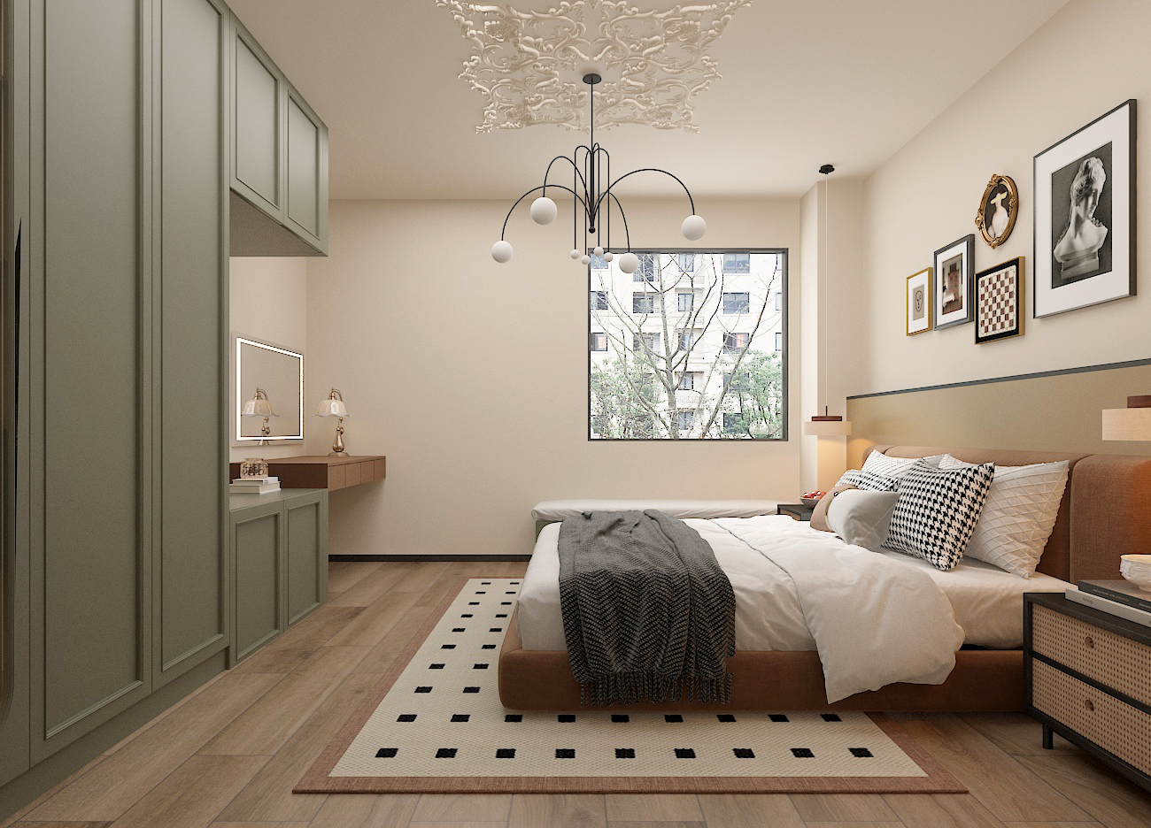 案例:在臥室中,使用一件布藝床具佈置軟包靠背,加入羊毛地毯和暖光燈,讓空間既現代又溫暖。