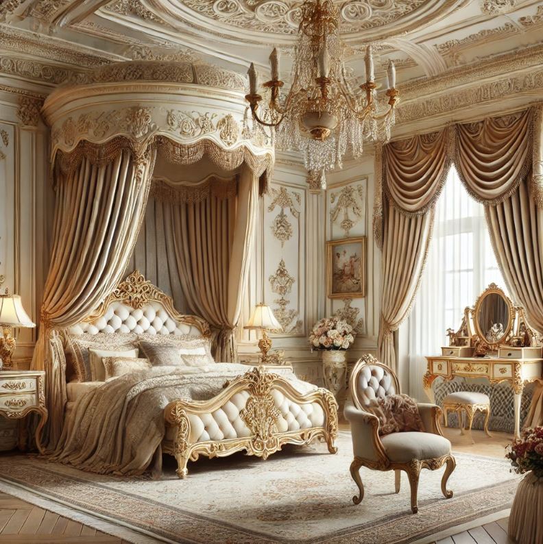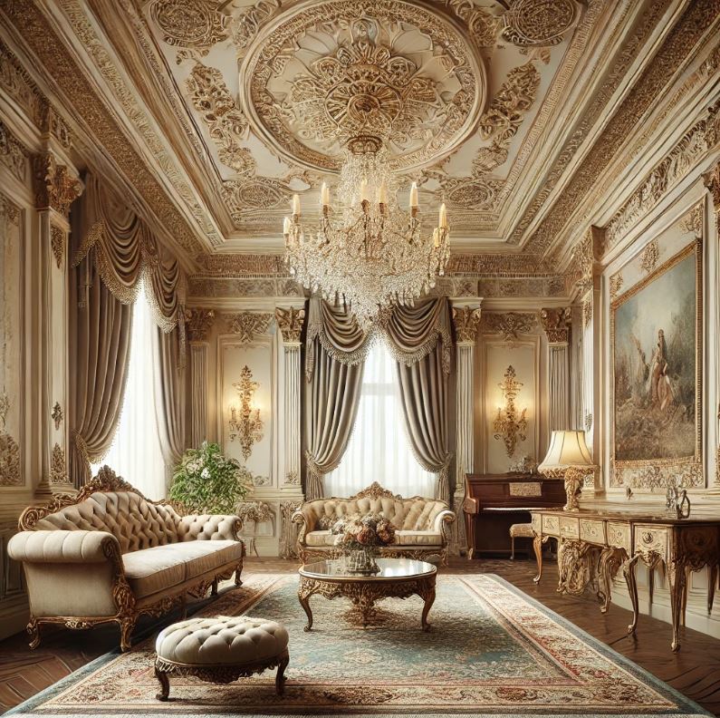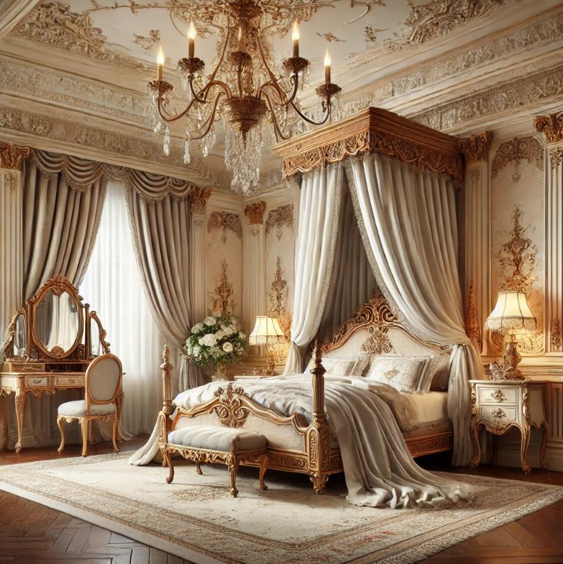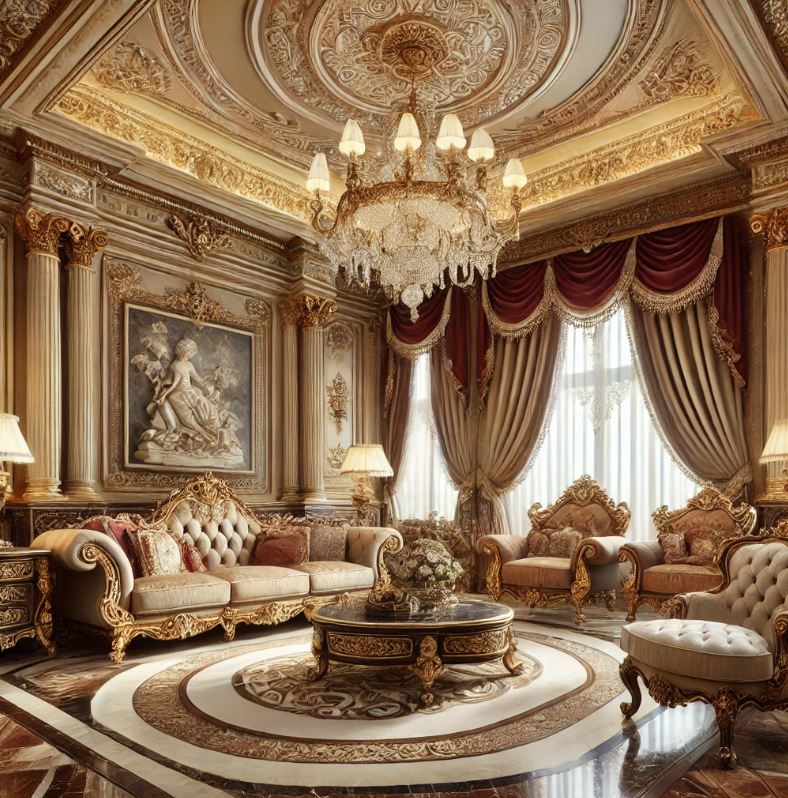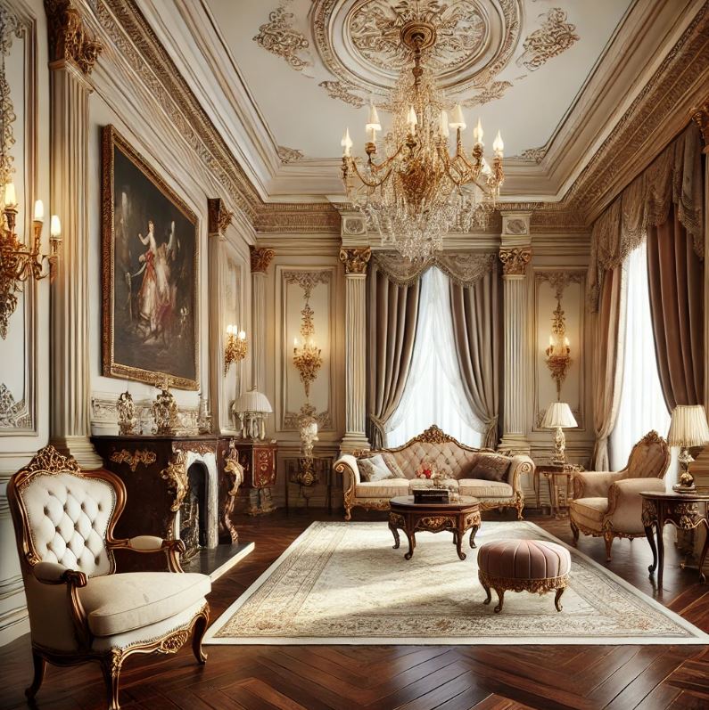 - 地板與牆面:採用大理石地板或木質地板,搭配壁紙或木護牆板,塑造整體的華麗感。