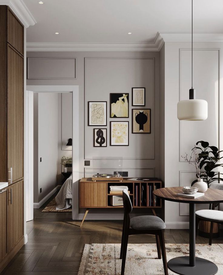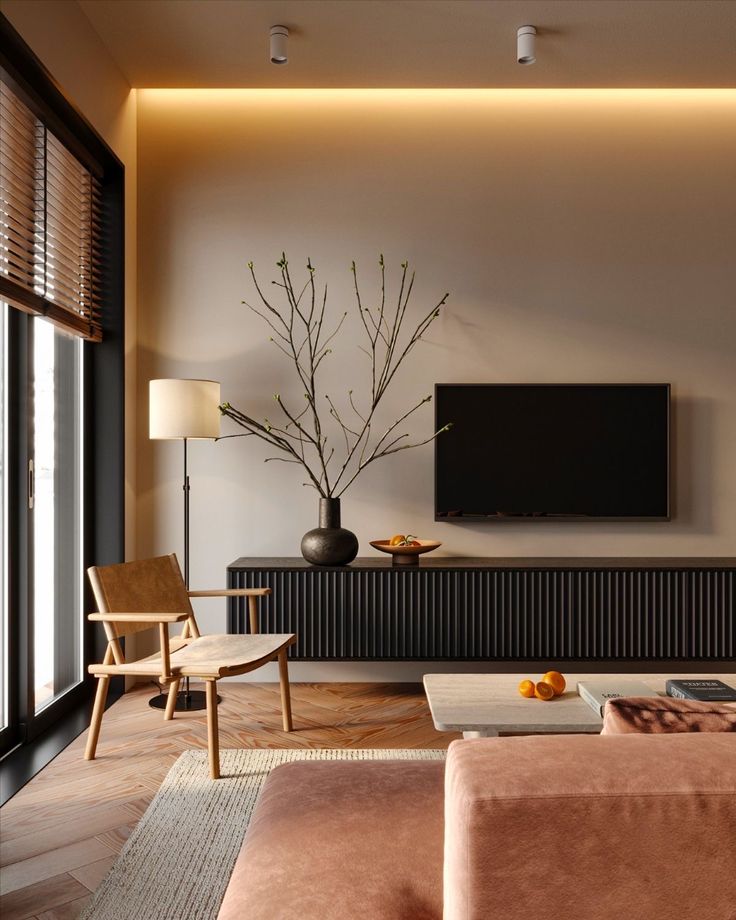 以柔和的中性色為主,如米白、淺灰,搭配深色木質家具,營造溫暖層次感。