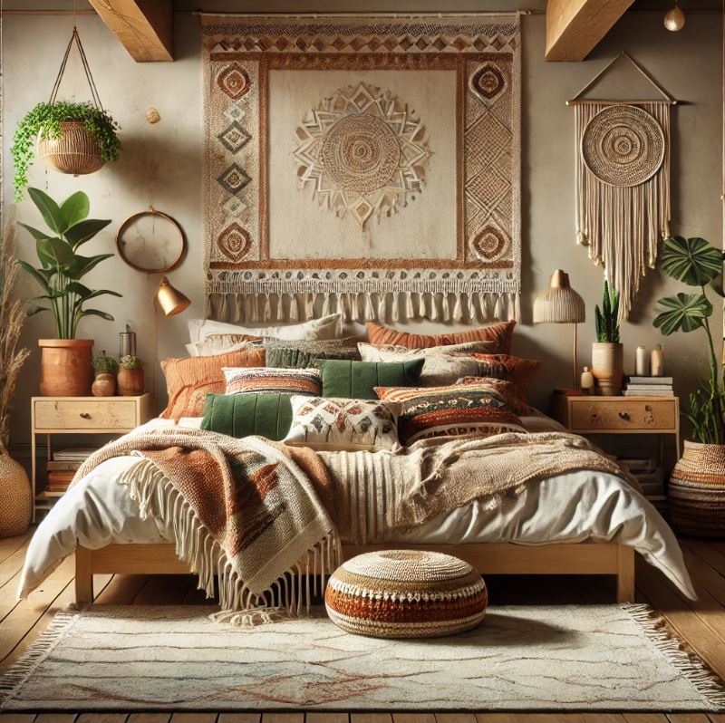 波西米亞風格臥室以舒適為重,選擇低矮木床,搭配多層棉麻床品,如毛毯與刺繡靠枕,提升溫暖感。