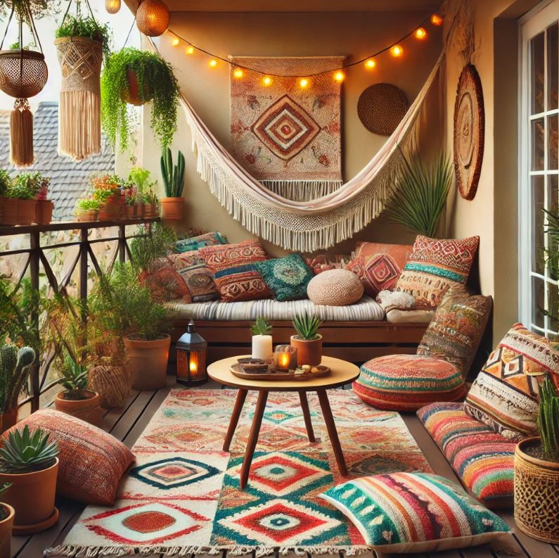戶外空間是波西米亞風格不可忽視的一部分,選擇藤編椅與桌子作為主要家具,並搭配彩色坐墊,增添活力與舒適感。