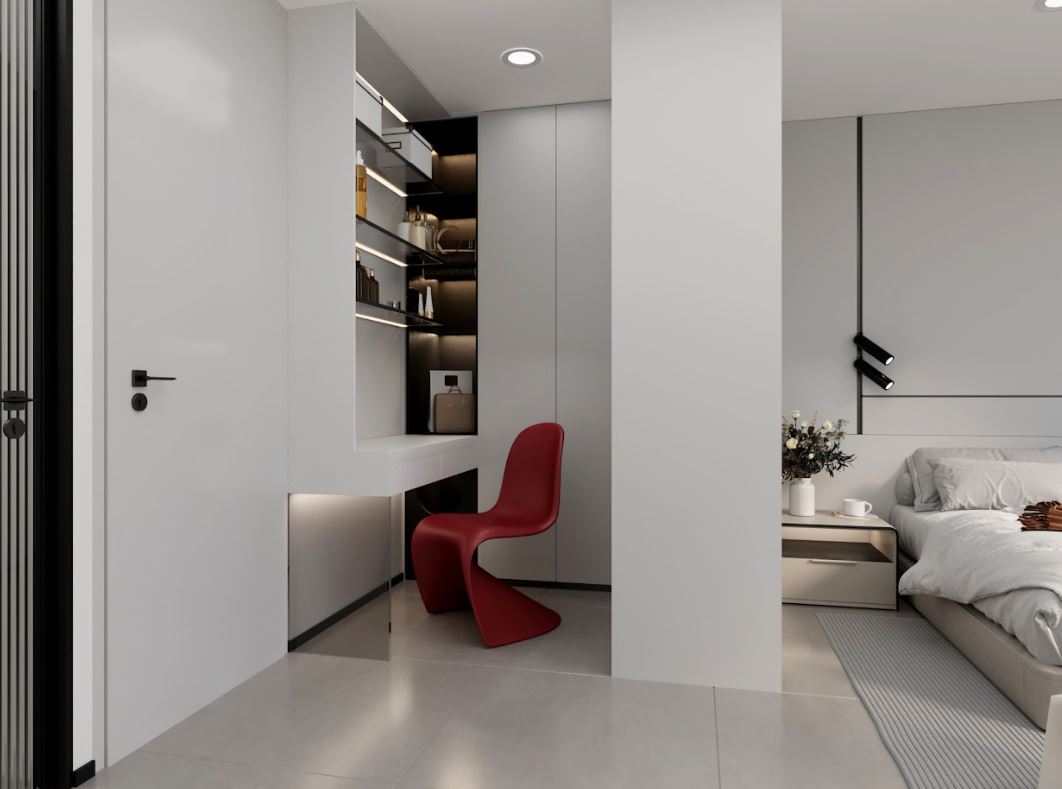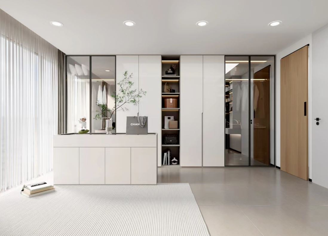 隱藏式更衣區:採用拉門設計,將衣物收納區隱藏起來,保持整潔。