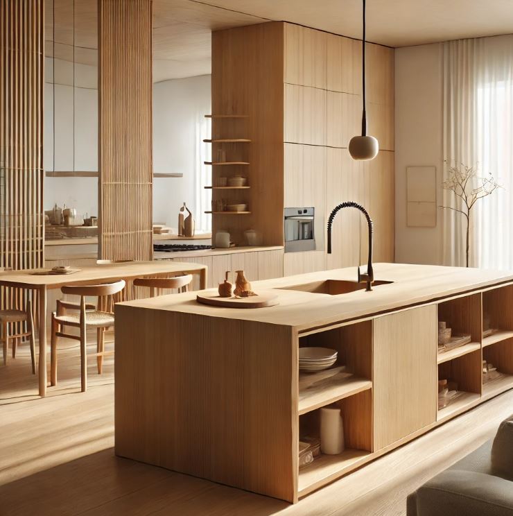 日式無印風:溫潤木紋 + 內嵌式收納設計,營造自然且整潔的空間感。