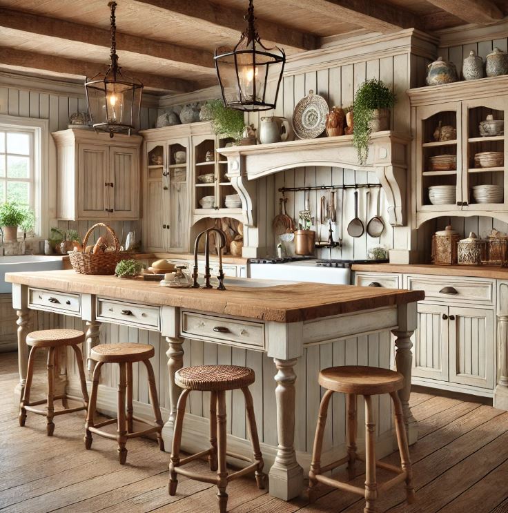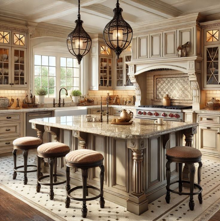 美式鄉村風:大理石中島 + 開放式層架,搭配吊燈展現復古氛圍。