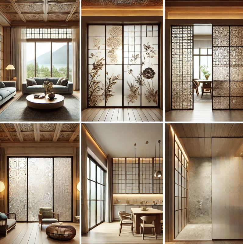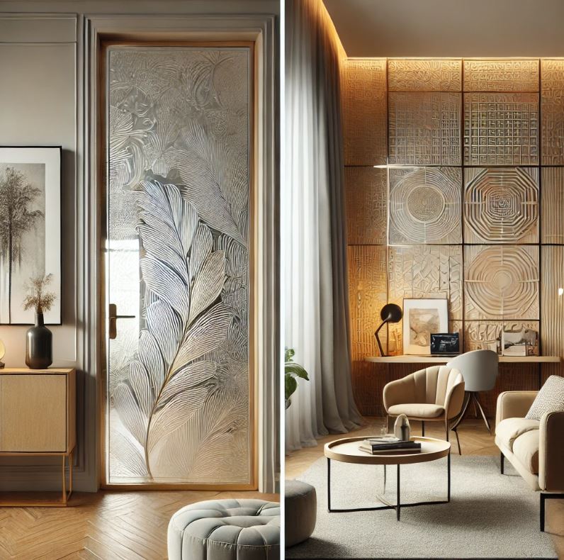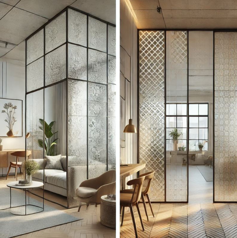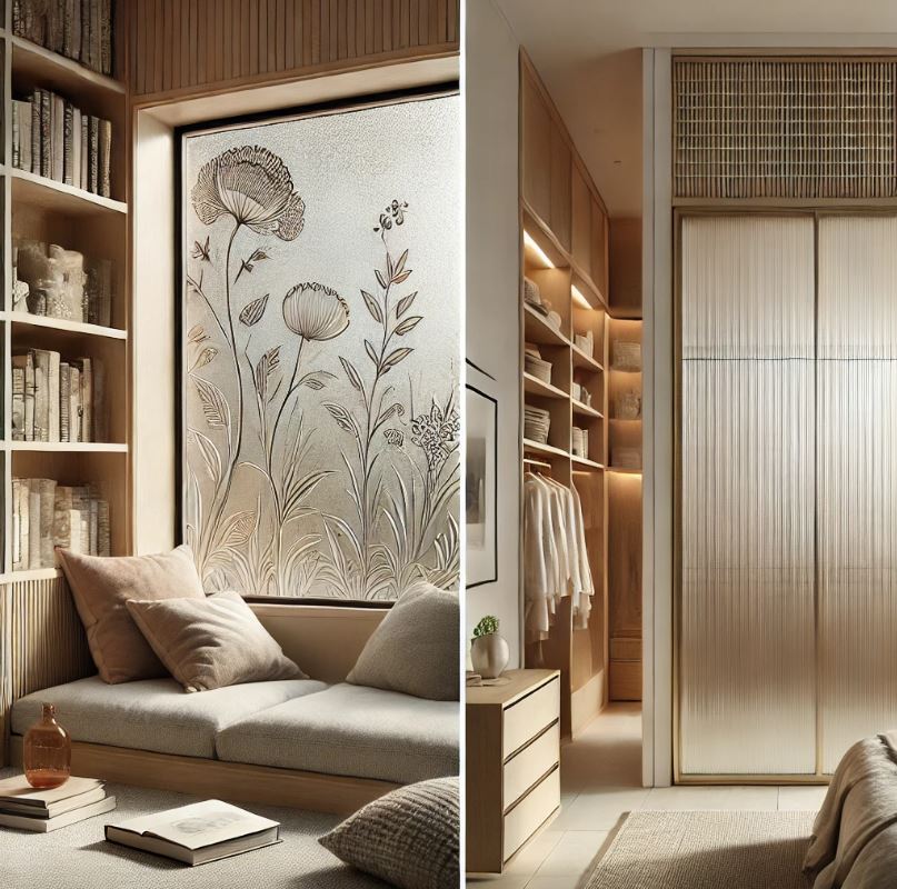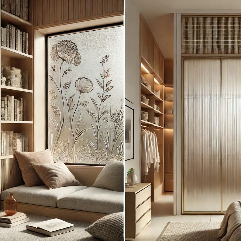 這類設計常見於住宅中的浴室門、客廳窗戶、隔斷門以及辦公室隔牆,幫助提升空間的私密性與裝飾性。