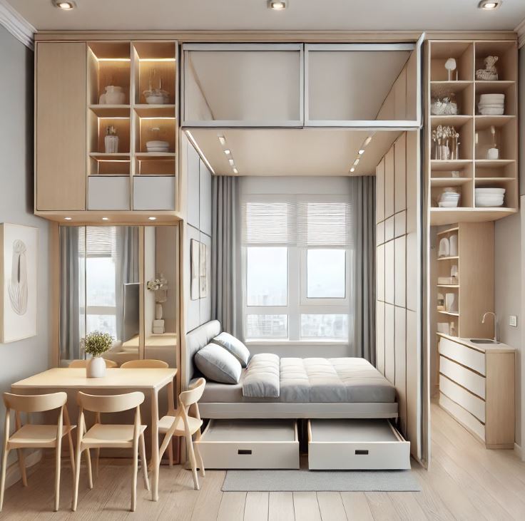 小空間:選擇可折疊、堆疊或具有隱藏儲物功能的系統家具,如折疊餐桌、隱藏式沙發床等。
