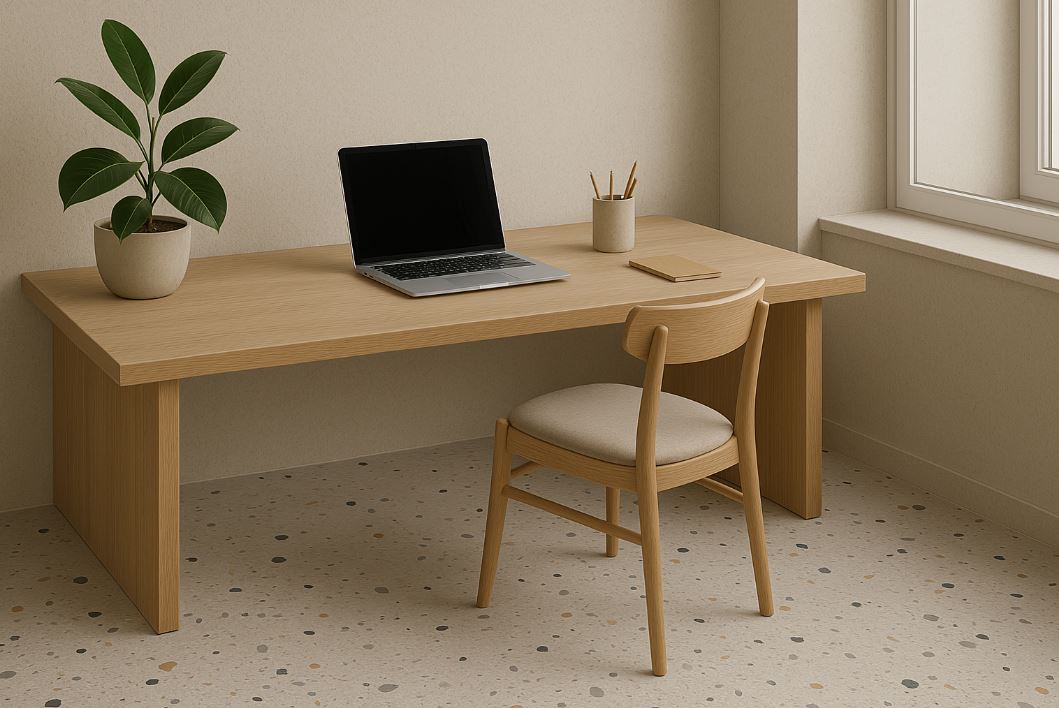 木材:木質材質能為工作室增添溫暖和自然感,尤其適合需要長時間工作的區域,如辦公桌或書架。木材質感不僅舒適,還能營造出一種放鬆且宜人的氛圍。