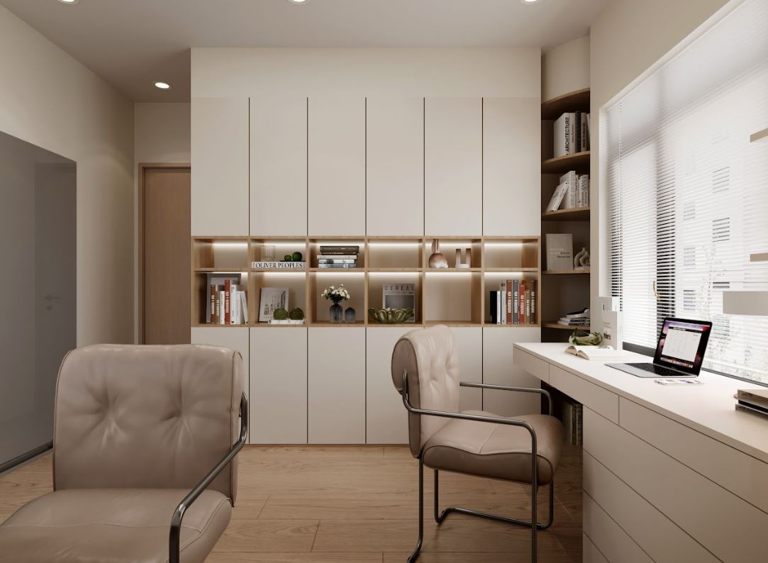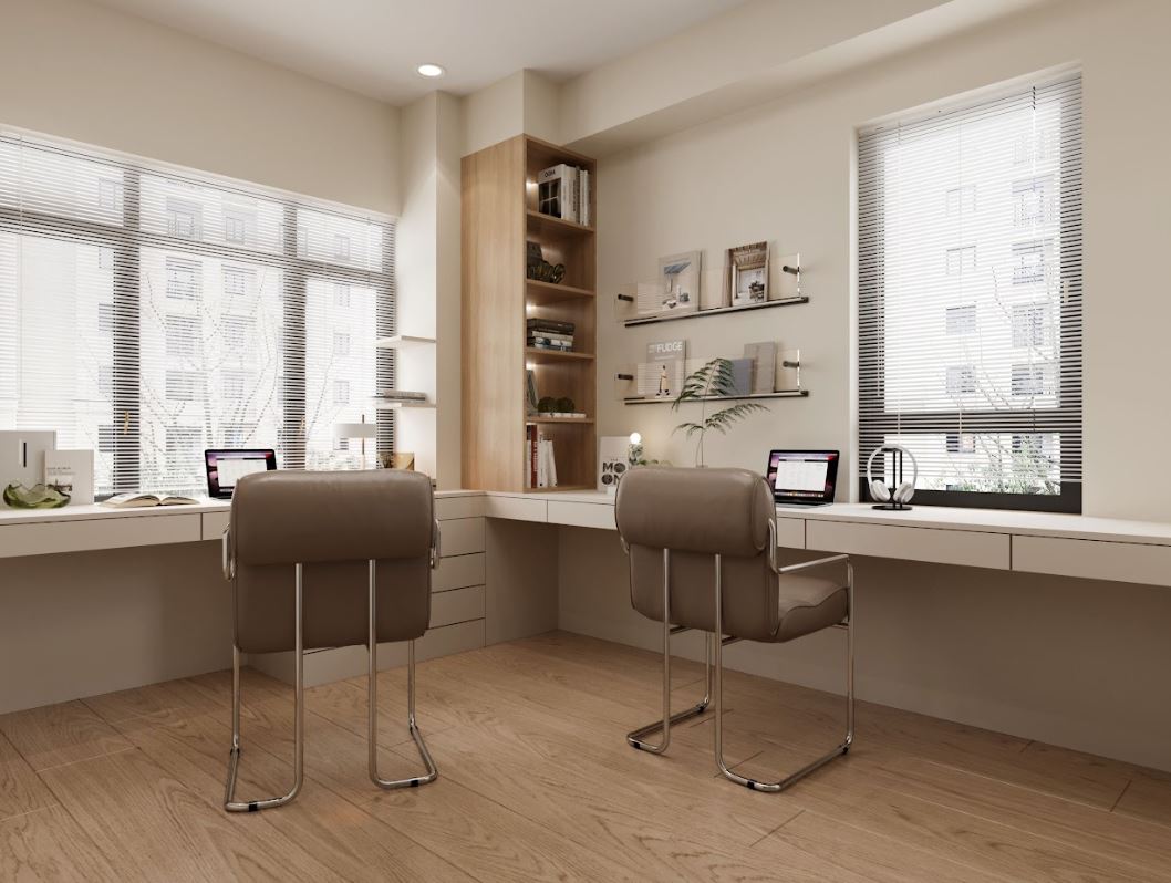 色彩搭配:選擇合適的顏色搭配能讓空間看起來更開闊並增強舒適感。冷色系(如灰色、白色)適合專注的工作環境,而暖色系(如米色、淡木色)則有助於提升創意氛圍。