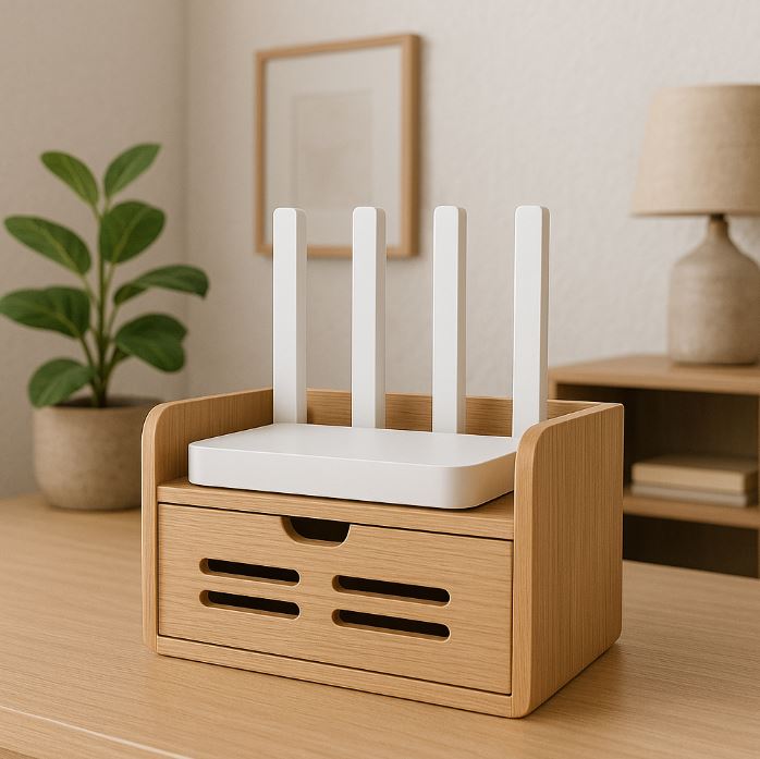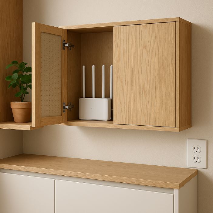 裝飾性遮蔽板:選擇與室內設計風格相符的擋板,遮住路由器與電線,同時增添裝潢層次感,適合現代風、北歐風或日式簡約風。