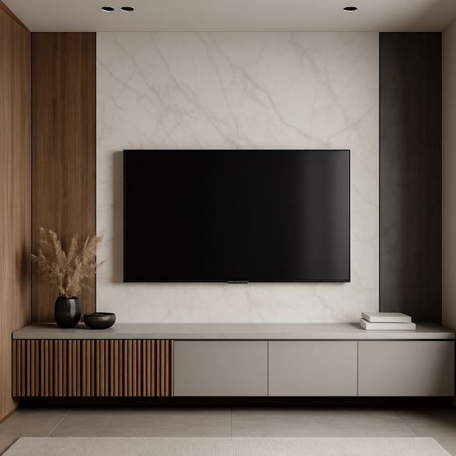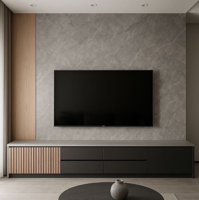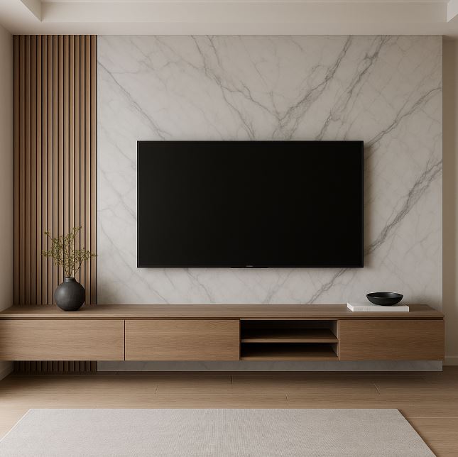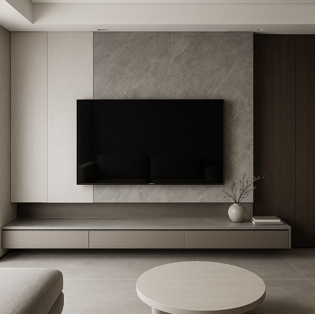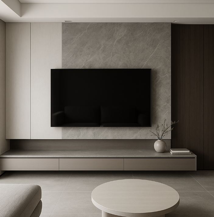 現代風電視牆設計:可選用光滑的大理石、烤漆玻璃或金屬面板,透過俐落線條與低彩度色調,打造簡潔、科技感十足的視覺效果,適合現代住宅空間。