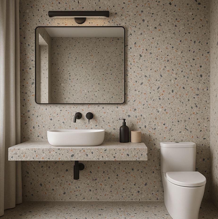 依照功能需求考量: 若安裝位置為廚房、浴室或玄關等潮濕易滑區域,建議優先選擇防滑性佳的洗石子或抿石子材質,不僅安全,也兼顧空間的整體質感。