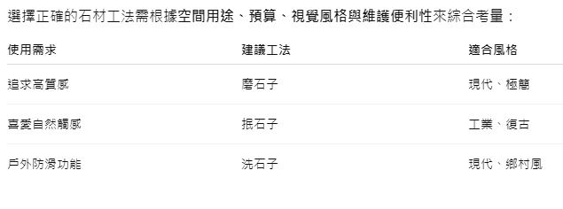 依據空間用途(如玄關、外牆、浴室、庭園)及預期的維護便利性與防滑性,合理選用石材能有效提升整體美觀度與實用性。
