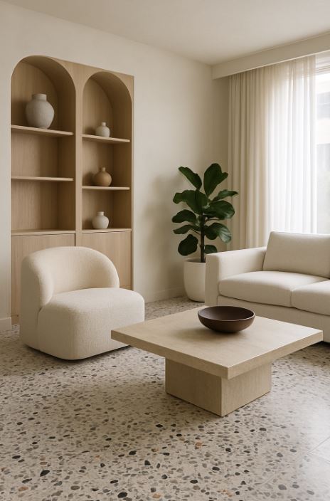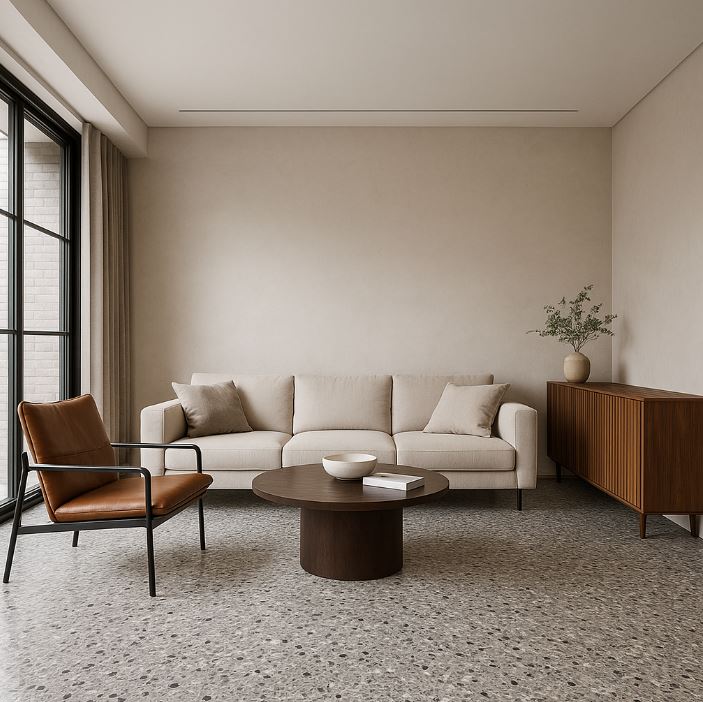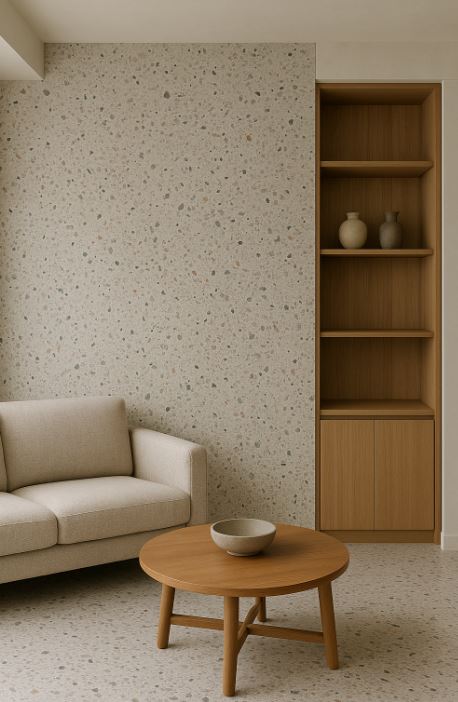 磨石子地坪因其平滑、耐磨與高質感的特性,非常適合應用於住宅的客廳、餐廳、玄關走道等室內空間,能營造出現代與經典兼具的氛圍。