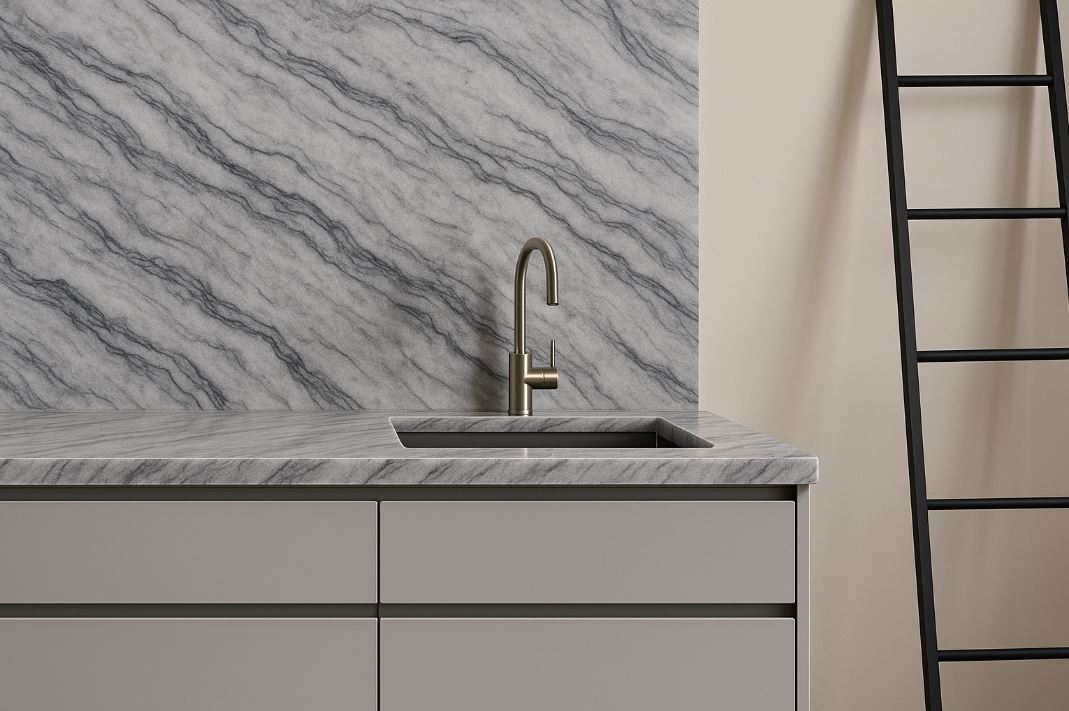 經過精細加工後的銀狐大理石具備良好的硬度與耐磨性,適用於高頻使用區域,如地坪、廚房檯面與中島等。