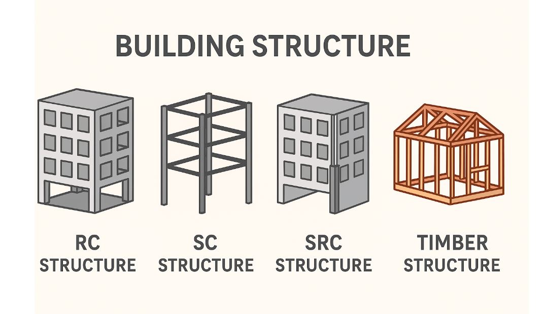 RC(鋼筋混凝土)結構:混凝土與鋼筋結合,廣泛應用於住宅與商辦大樓。