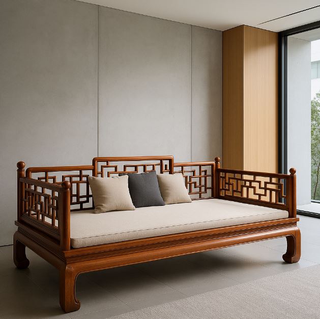 尺寸建議:1800×900 mm 羅漢床,搭配低榻几與兩顆 450 mm 抱枕。