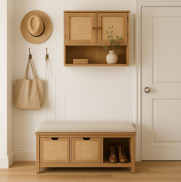把玄關椅與收納整合成一體,不只省坪、還能把動線與落物秩序化。