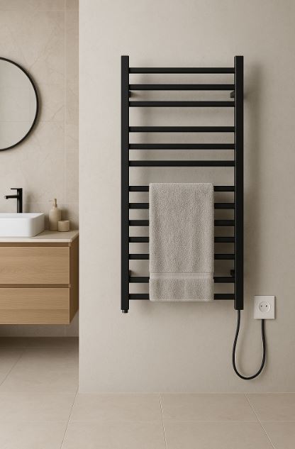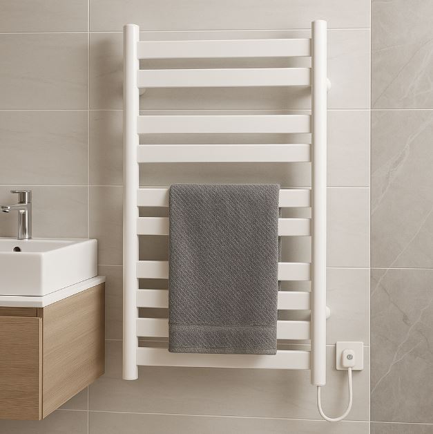 電熱毛巾架可在40–60°C 表面溫下持續烘乾布料,改善異味與細菌滋生,同時兼作毛巾置物與微量輻射供暖。