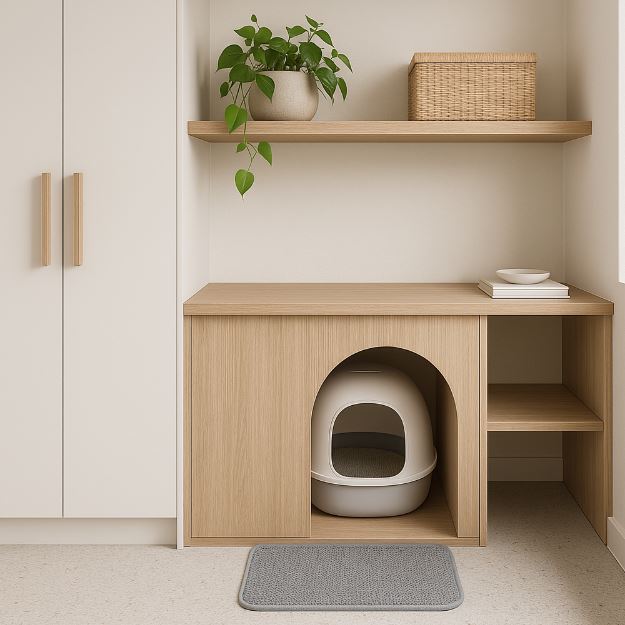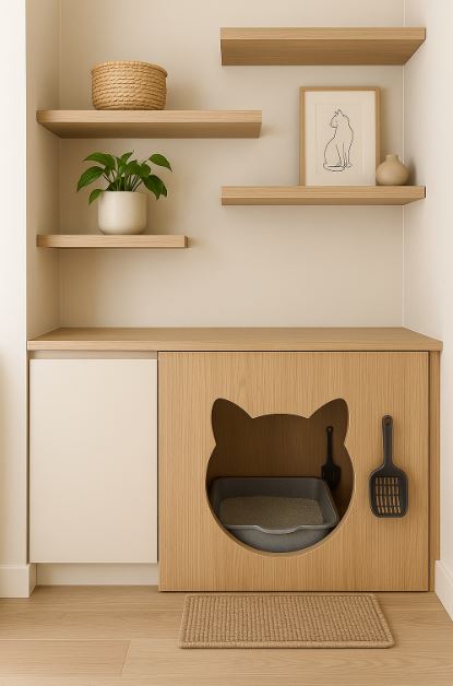 若家中使用 機械式自動貓砂盆(如 Litter-Robot、小佩、自動滾筒機型),櫃體在設計上必須更精準,才能確保設備運作穩定又安全。