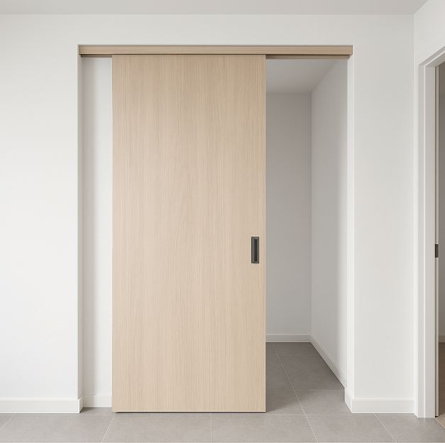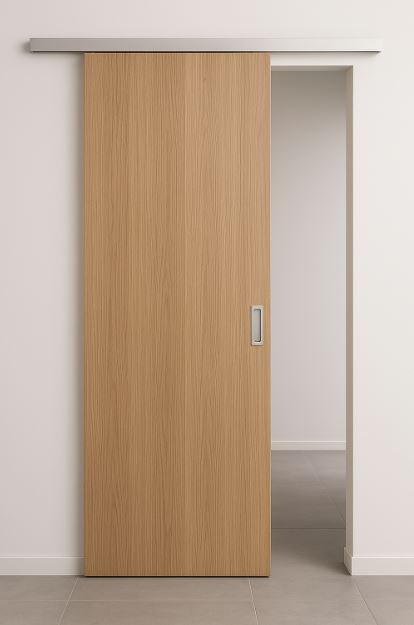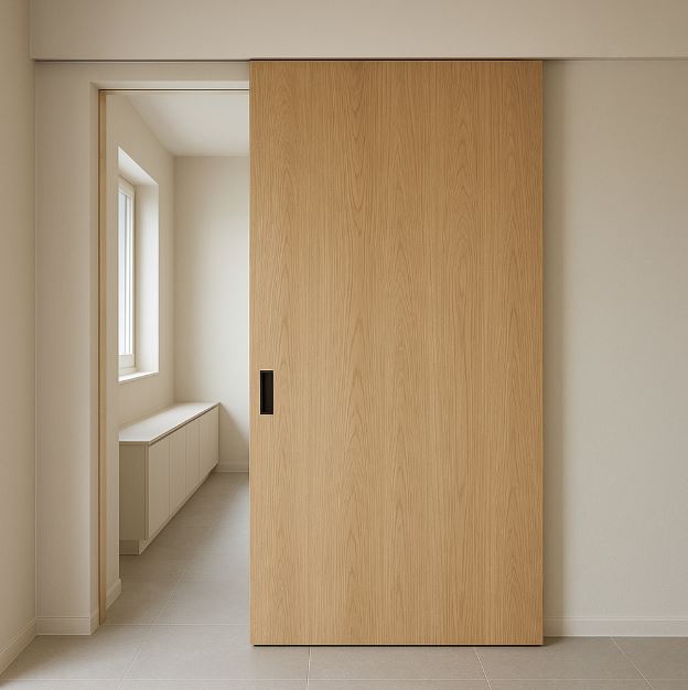 隱吊式拉門(Hidden ceiling-hung sliding door)把上軌埋入天花,視覺極簡、門面連續,是現代宅與商空愛用方案。