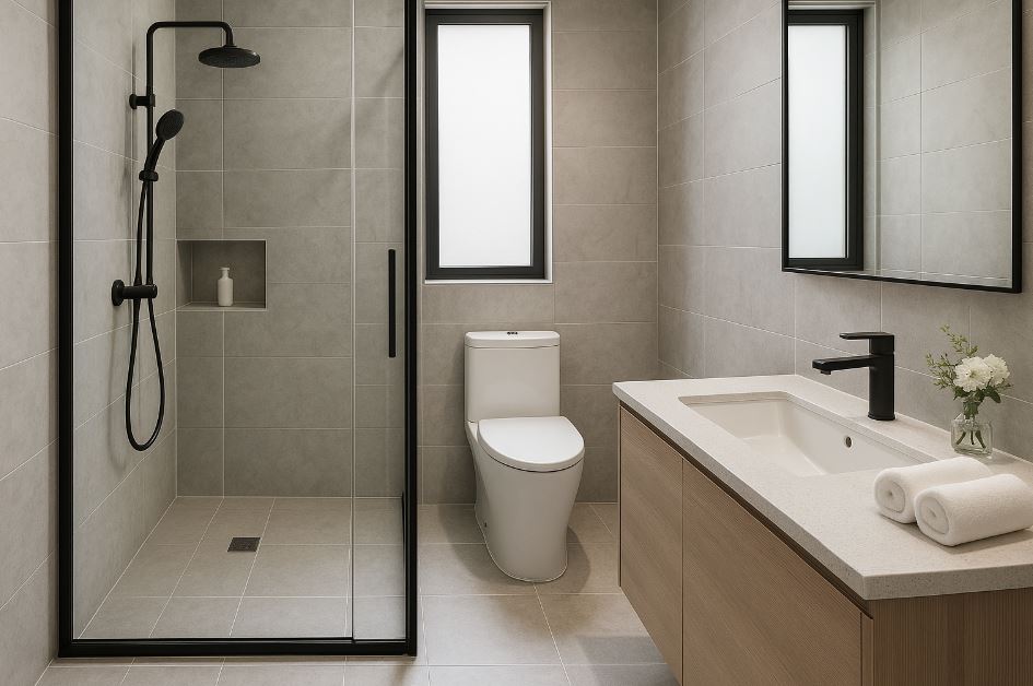 先投資在排水找坡與防水閉水、換氣扇升級、止水設計;玻璃或門可後補。