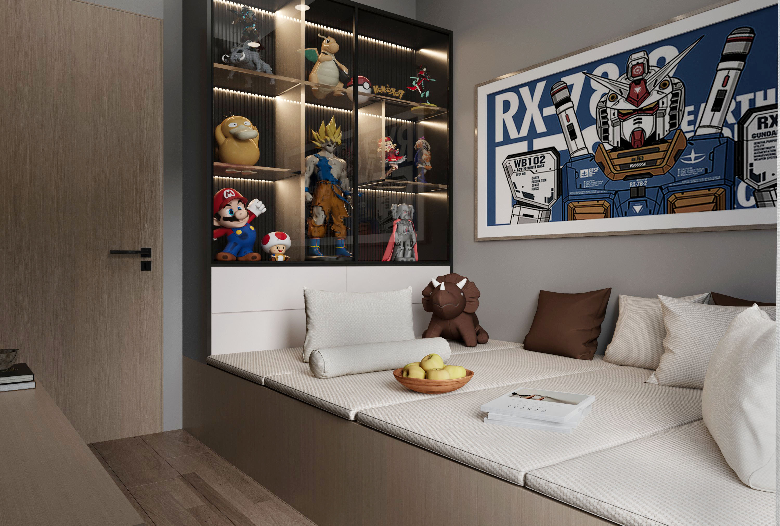 在日式簡約風格的設計中,次臥室的臥榻為舒適的休憩之地,上方安置床墊,增添了空間娛樂的多功能性。臥榻旁的開放式展示高櫃提供了展示和儲物的靈活選擇,融合了實用與美感。臥榻對面設置了電視層板,方便娛樂活動。臥室的窗戶引入了自然光,為空間帶來了明亮與清新的氛圍。