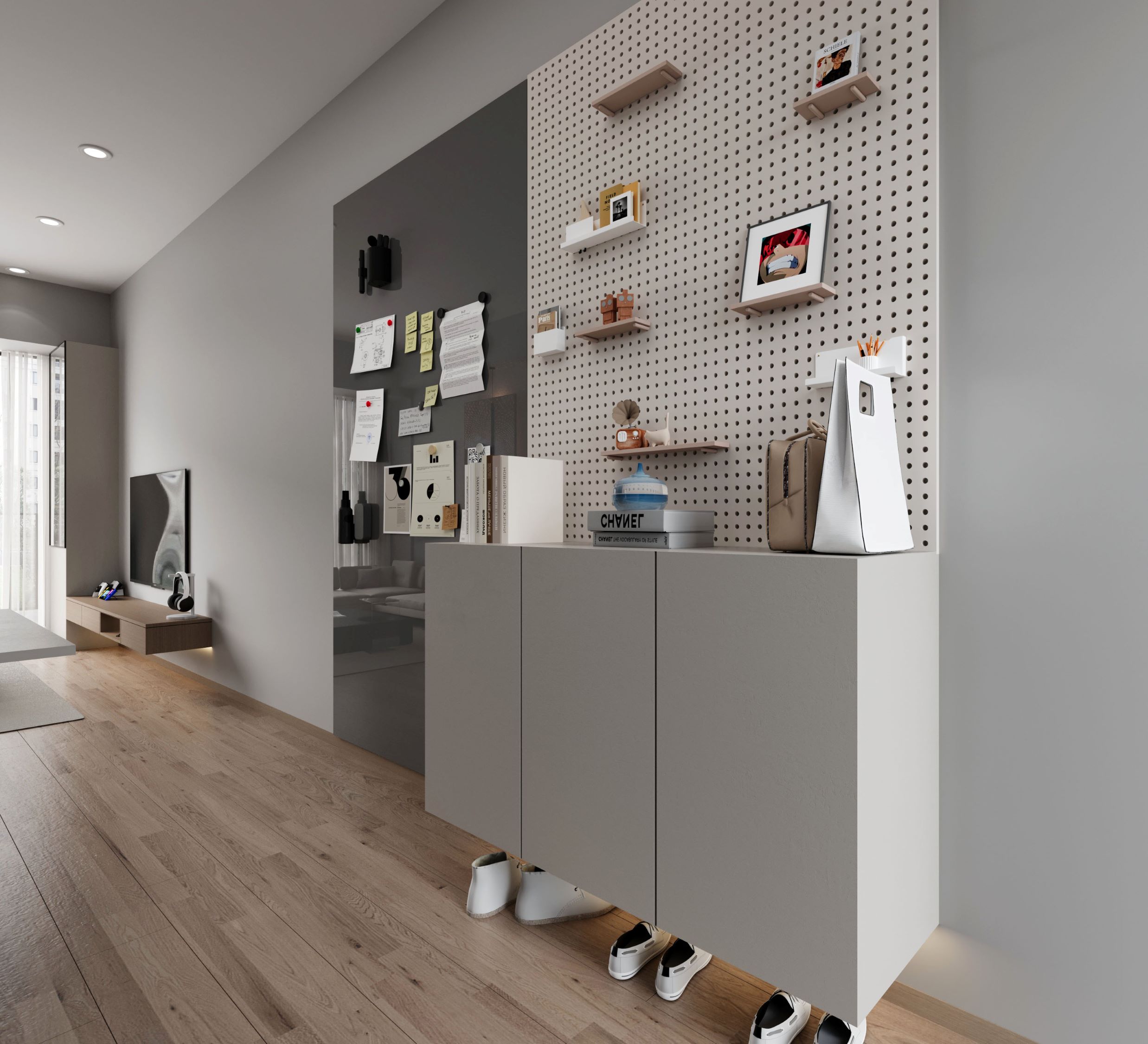 玄關的設計融合了實用性與現代風格。洞洞板提供了靈活的儲物方案,有效地將小物件整理得井井有條。懸空的矮櫃鞋櫃不僅增加了空間的開闊感,還使清理工作更加便捷。旁邊的玄關玻璃結合了實用與裝飾的功能,既便於書寫與記錄,又為玄關增添了現代的風貌。