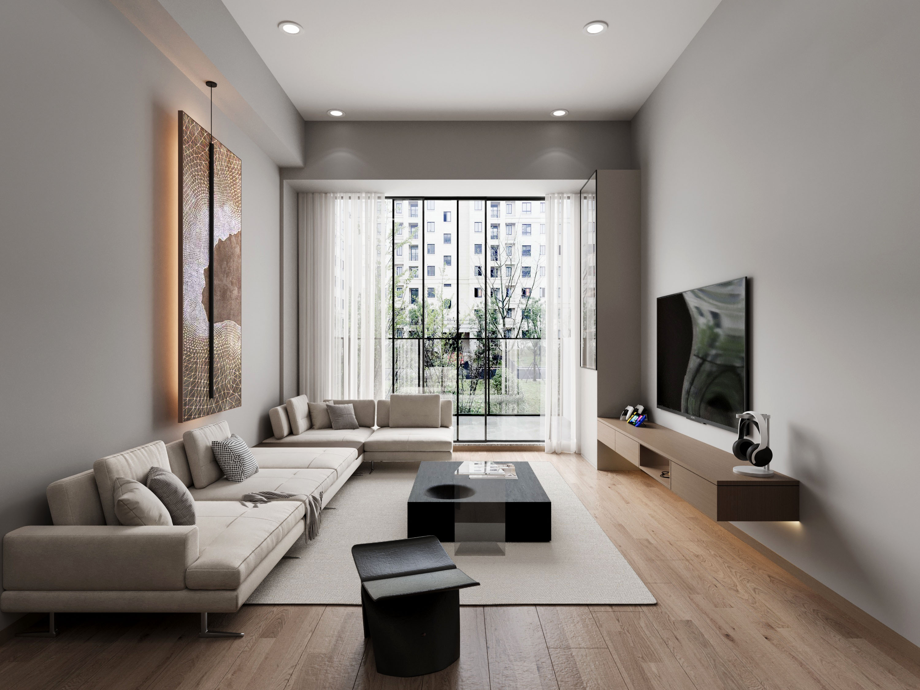 在日式簡約風格的設計理念中,客廳作為居家生活的核心,強調簡約而優雅的美學。懸空的電視櫃不僅提升了空間的視覺輕盈感,還便於日常清理,讓居住空間保持整潔。落地窗的設置最大化地引入自然光,將陽台與室內無縫融合,增強了整體空間的通透感和明亮度。沙發的選擇兼具簡約與舒適,與崁燈的柔和光線相得益彰,共同打造出一個放鬆而和諧的生活氛圍。