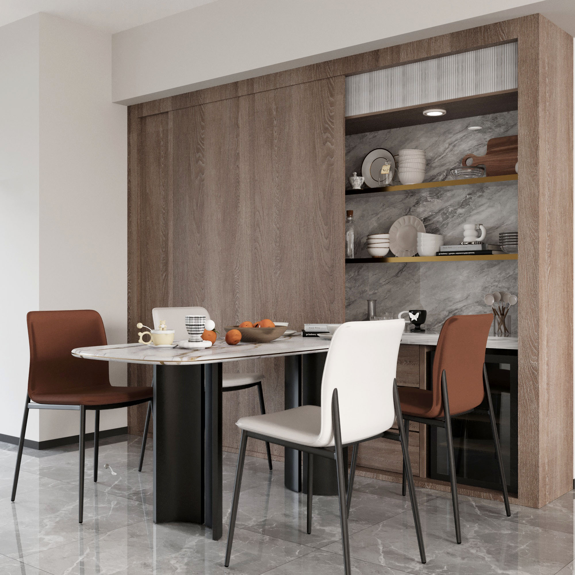開放式展示架擺放精美餐具,兼具實用與美觀。圓角餐桌柔和流暢,