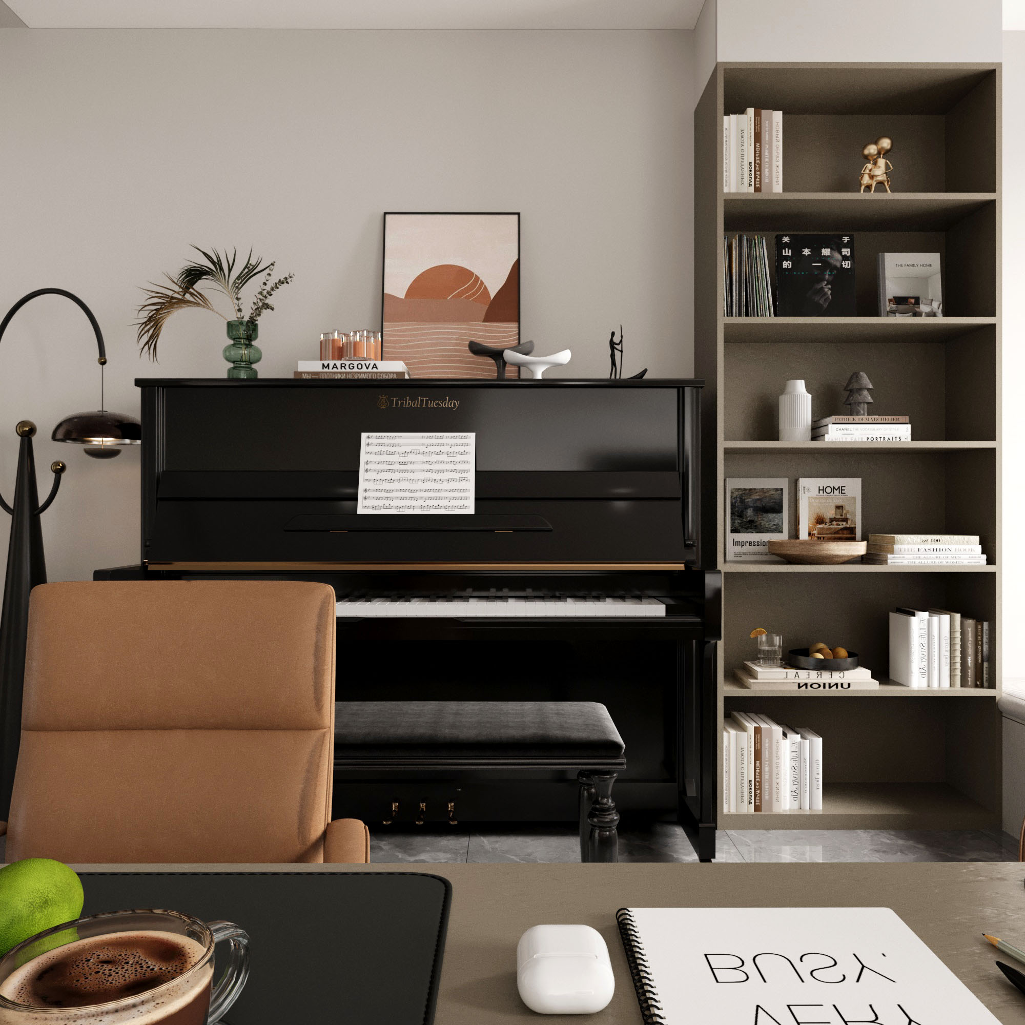黑色立式鋼琴成為焦點,柔和燈光下的樂譜與裝飾品彰顯藝術與生活的融合。