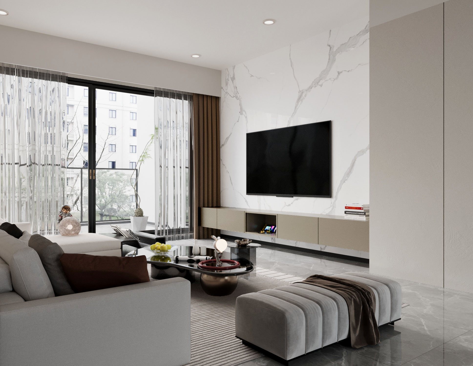 客廳則以溫暖的木質調和流暢的動線提供歡聚的理想場所,並搭配大面積的落地窗,讓充足的自然光線灑滿空間,