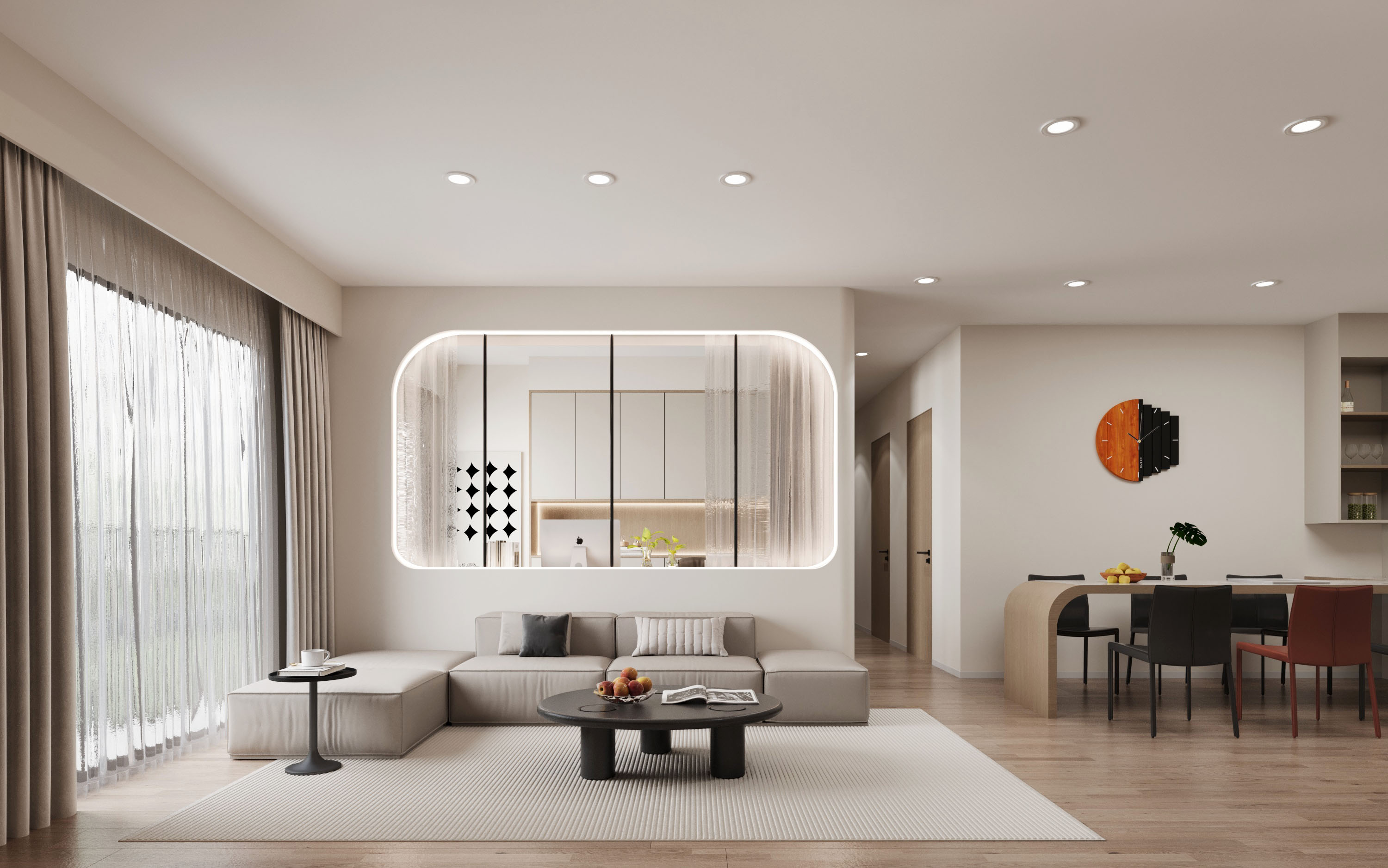 中央的圓形茶几與地毯之間形成了鮮明而和諧的對比,整體設計以簡約為基調,卻不失現代感的精緻。