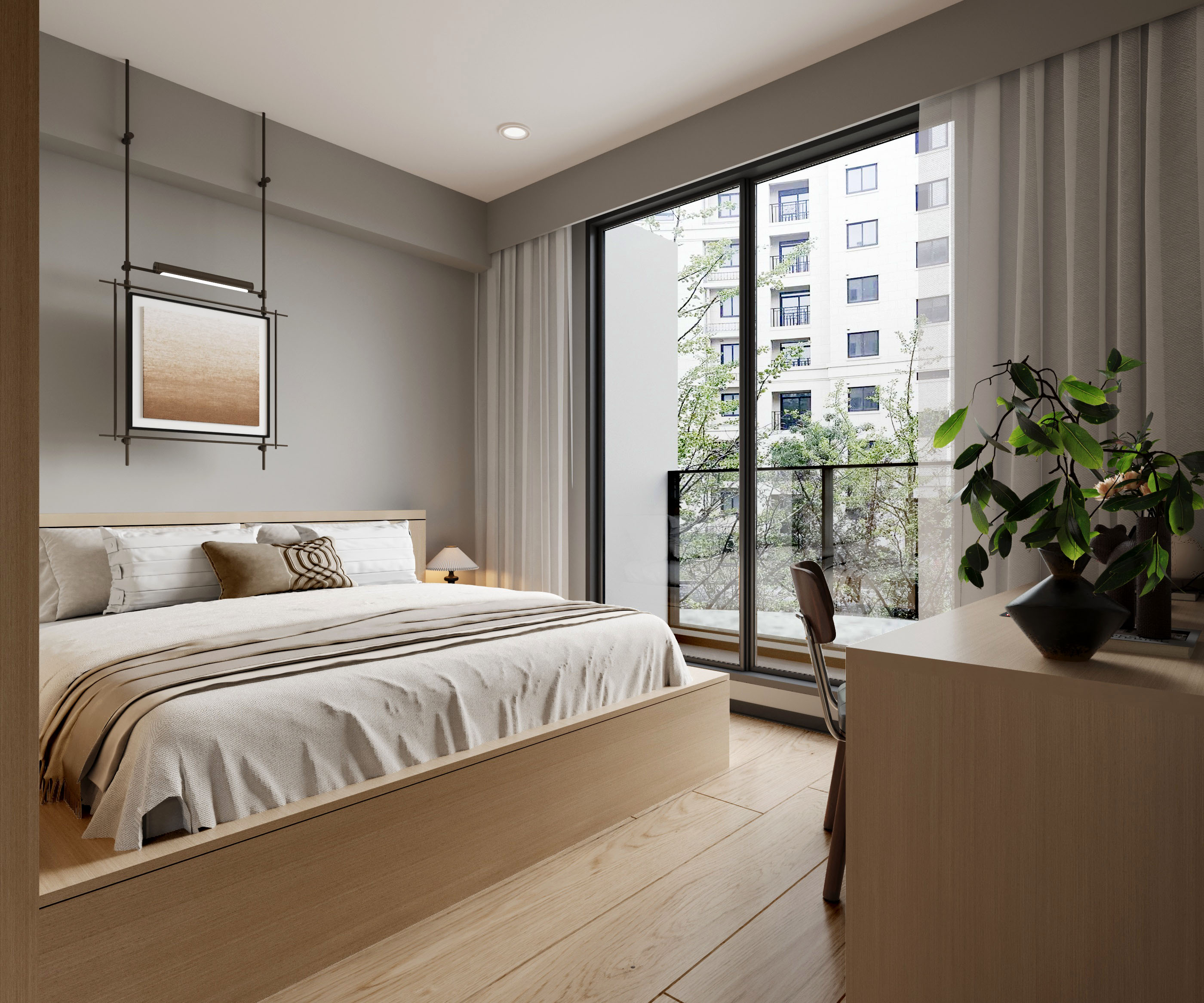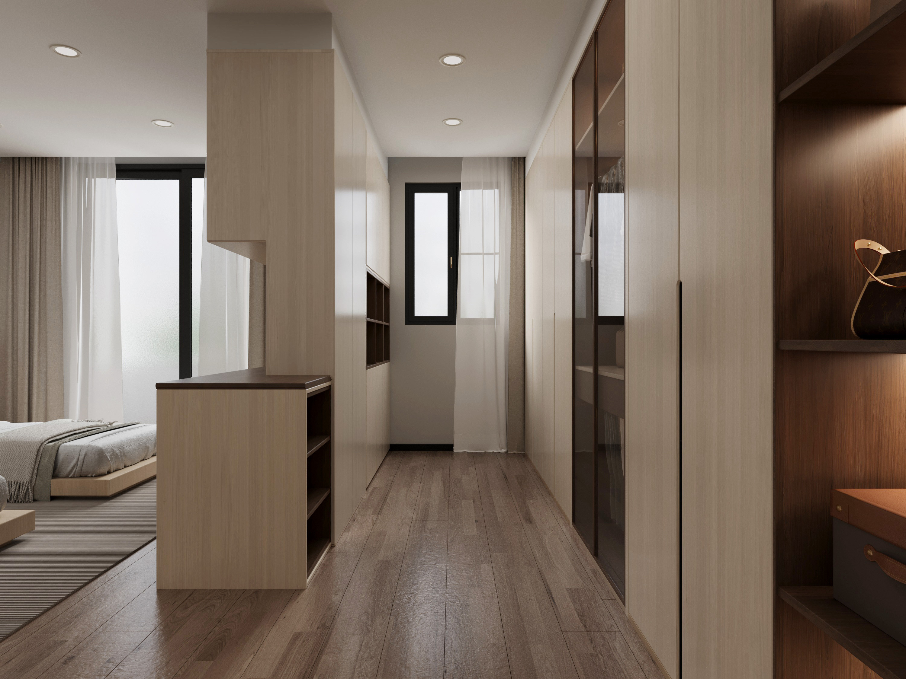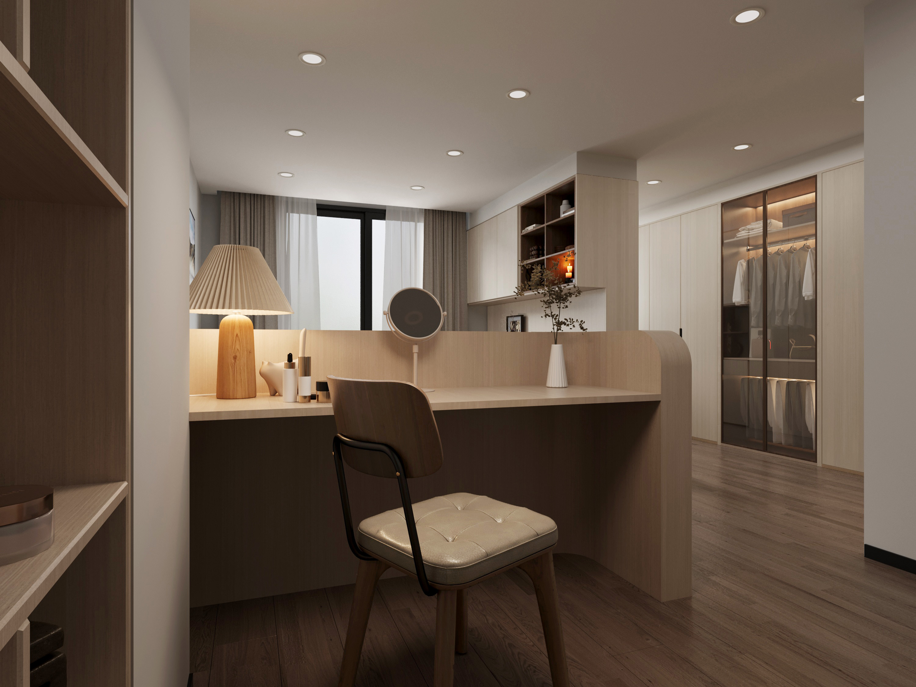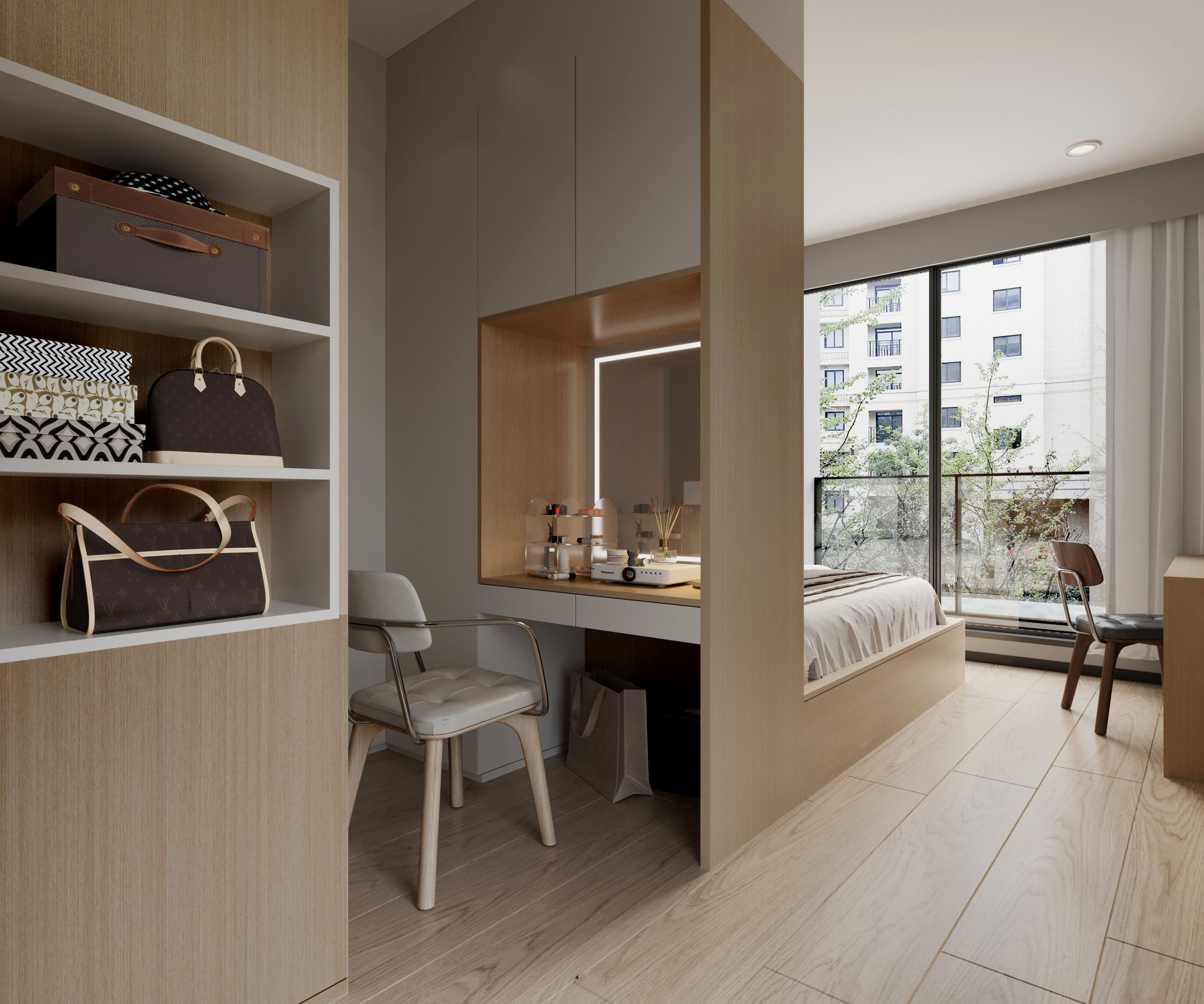 設計中建立了一面矮牆,矮牆後方設置梳妝台,側邊配有額外的收納空間,方便日常使用。系統櫃的設計則運用白木紋與原木色調,既美觀又實用,提供了充足的儲物空間,保持整體空間整潔有序。大面積的落地窗引入充足的自然光,讓陽光灑進房間,增添明亮感與舒適度,營造出溫馨而實用的生活環境。