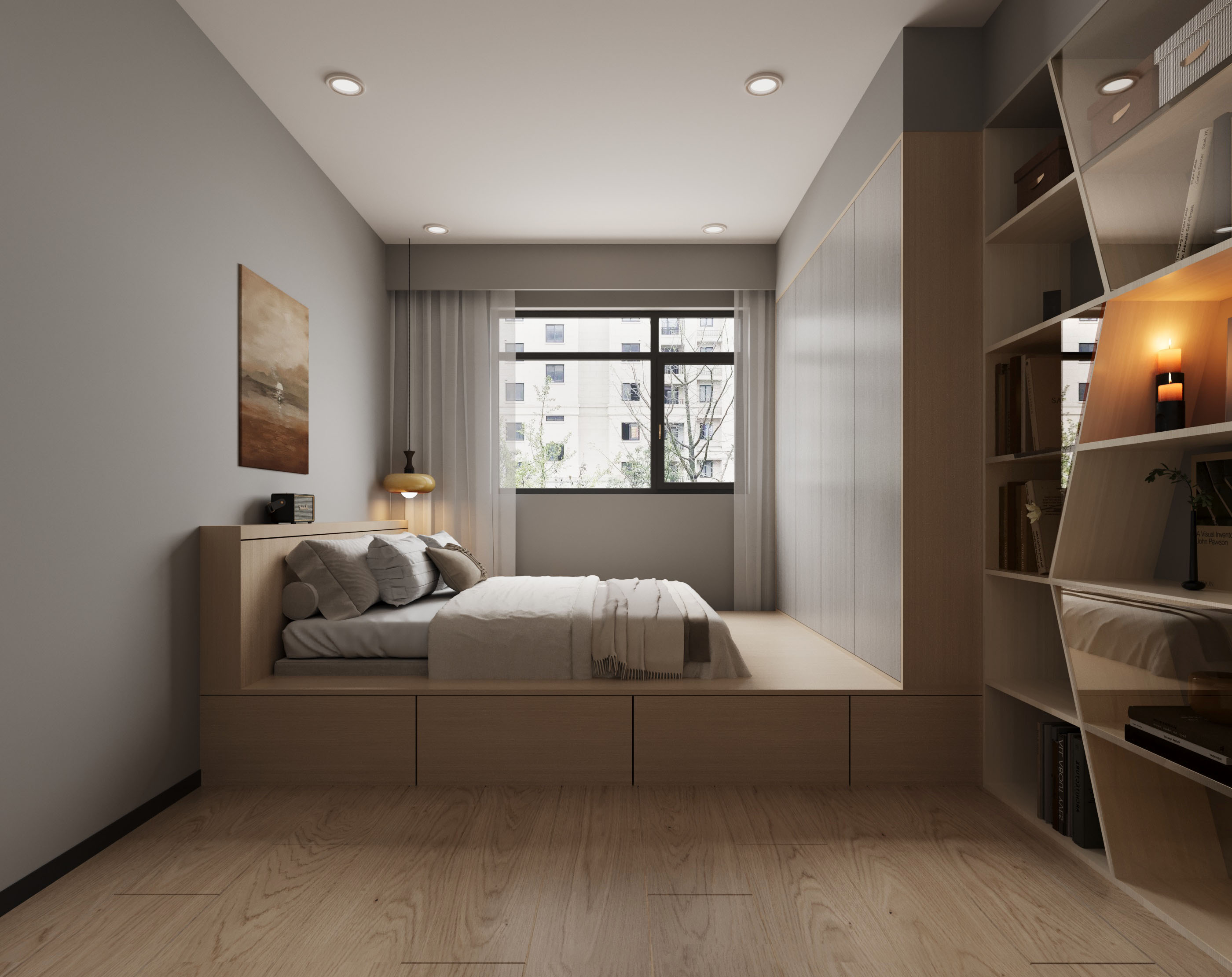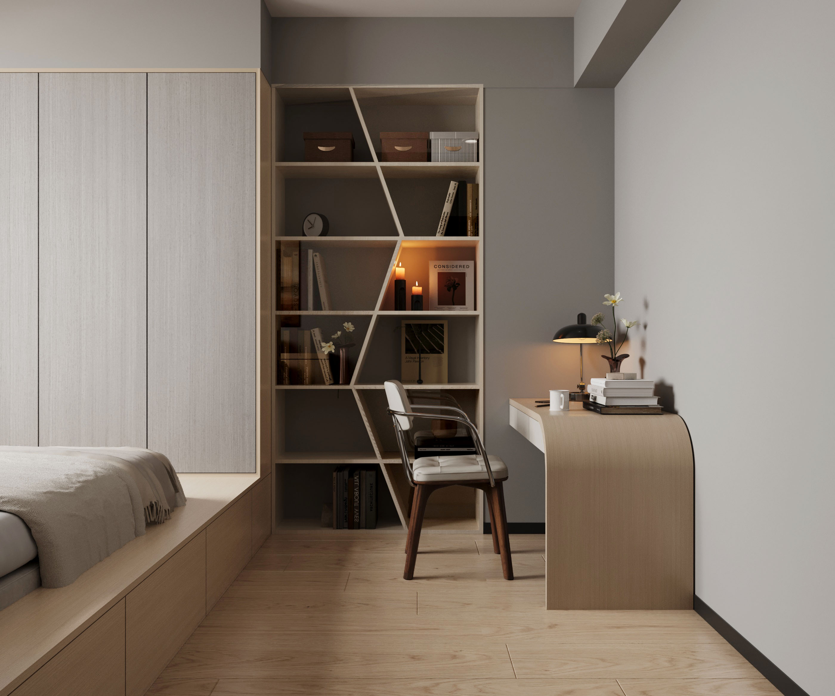 臥榻設計不僅增添了額外的收納功能,營造出一個舒適的休憩區域。使主人在繁忙的生活中享有一片私密的安靜天地,。化妝台的設置提升了日常生活的便利性,使生活打理更輕便。整理空間的流暢設計與多功能性相得益彰,充分展現北歐風的精隨,進一步提升了居住的體驗的舒適感與愉悅感。