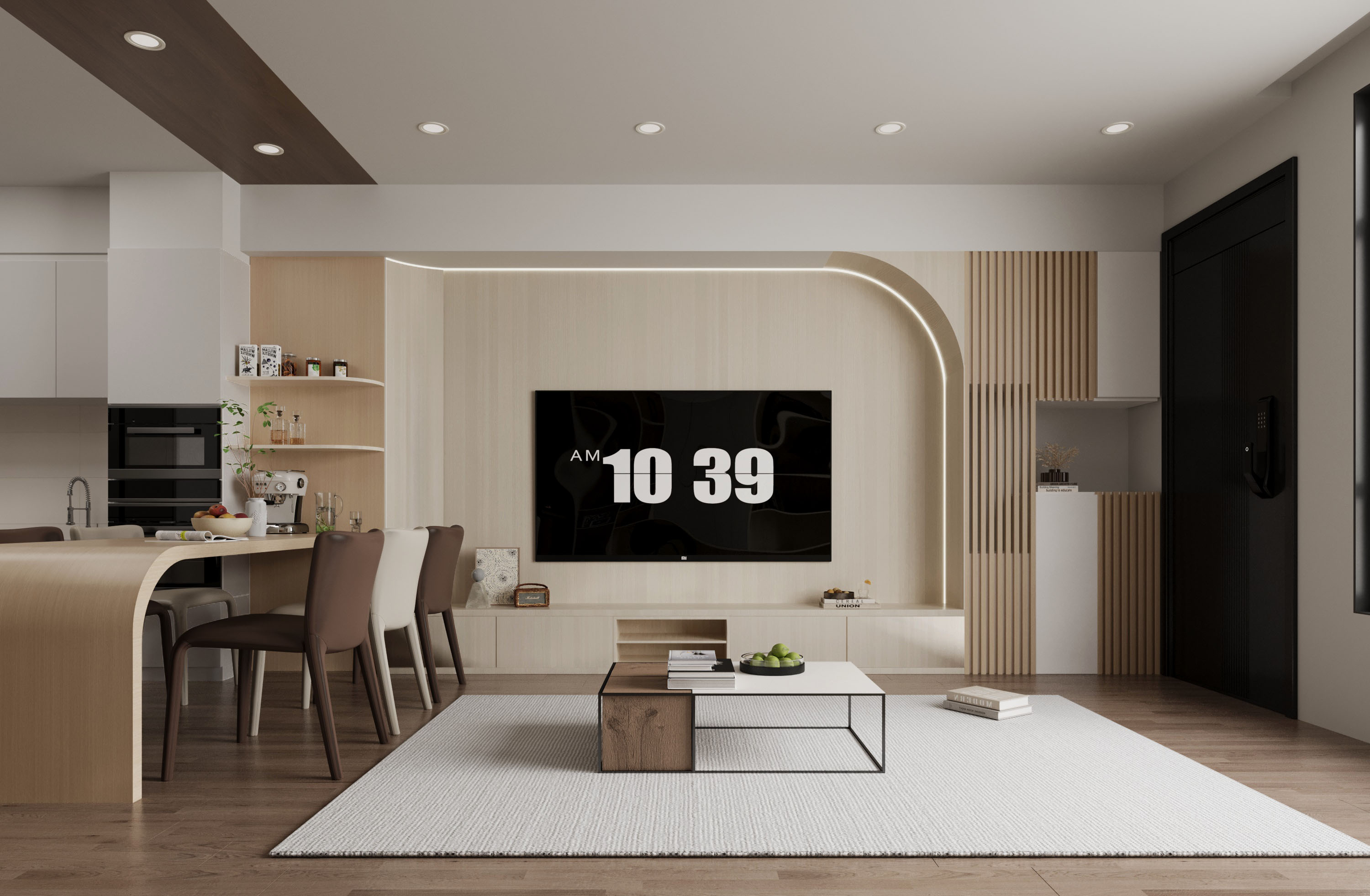 整體新成屋以輕日式風格為主,營造簡約自然的居住氛圍。一樓的開放式客餐廳設有大面積窗戶,採光極佳,讓自然光線充盈每個角落。電視牆圓弧形設計搭配下方燈帶,增添柔和的視覺效果。兩側的木質系統收納櫃提升了空間的美觀與實用性,而沙發後方的滿牆收納櫃則巧妙地結合餐廳,為一家人聚集共度時光提供了理想空間。