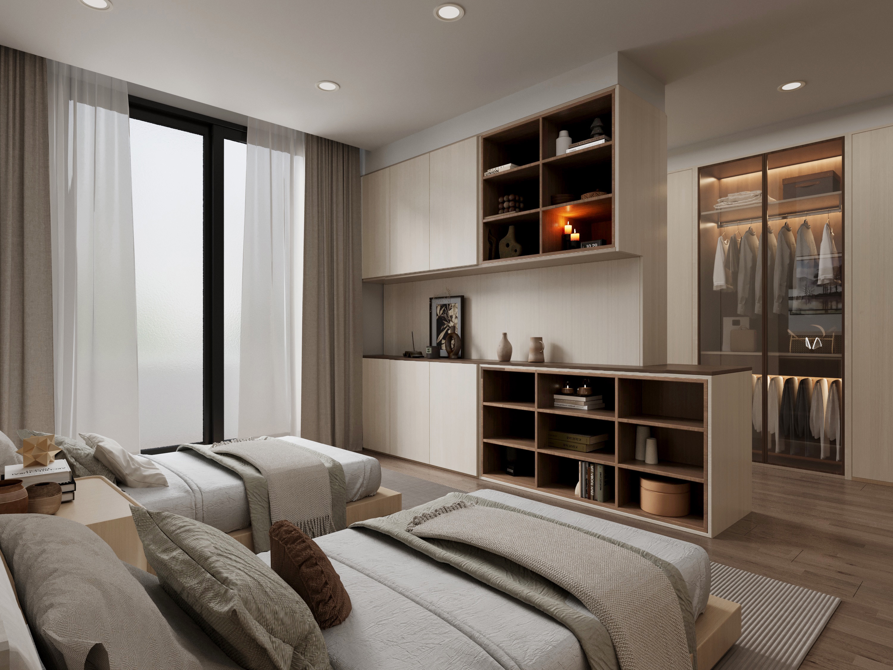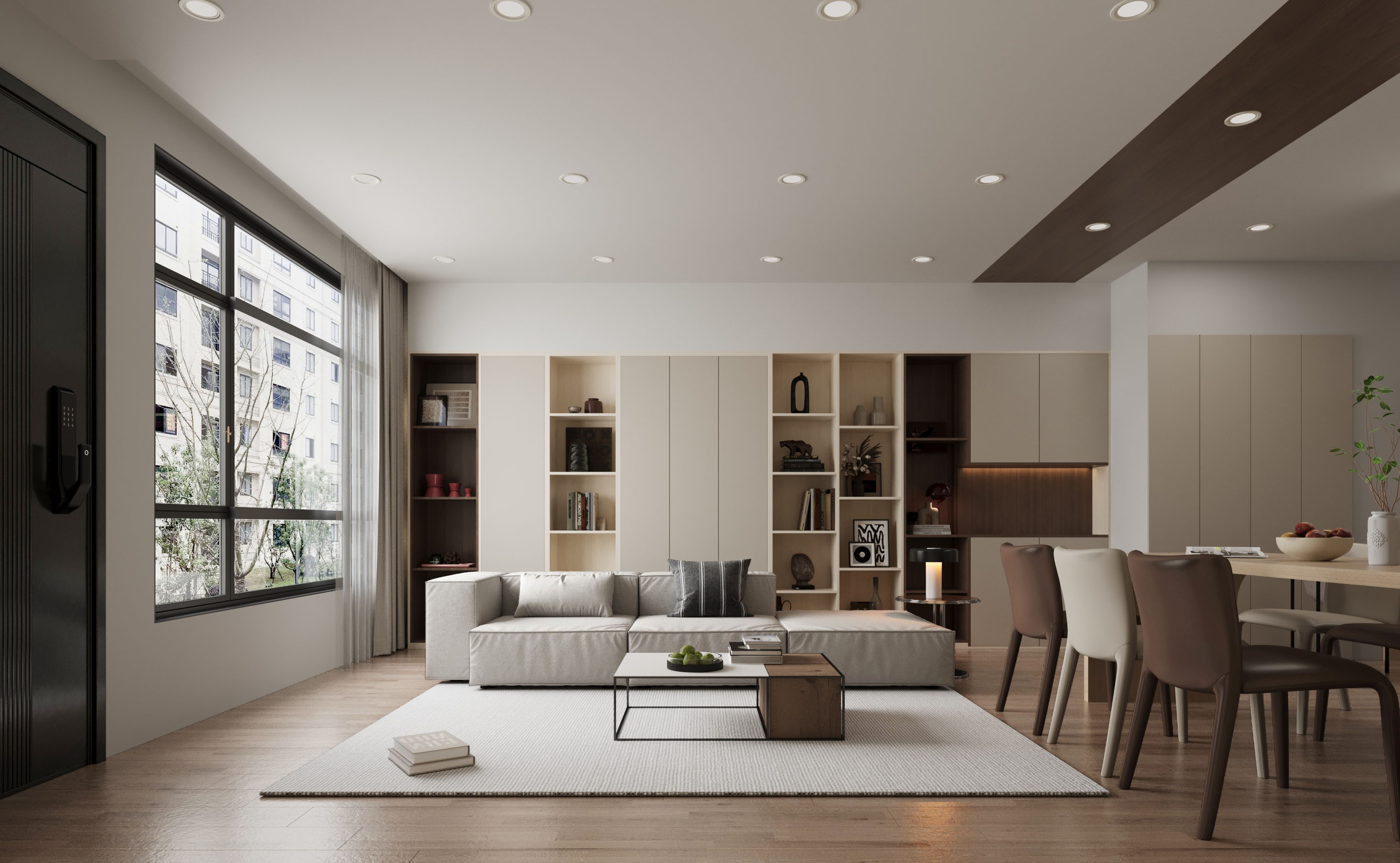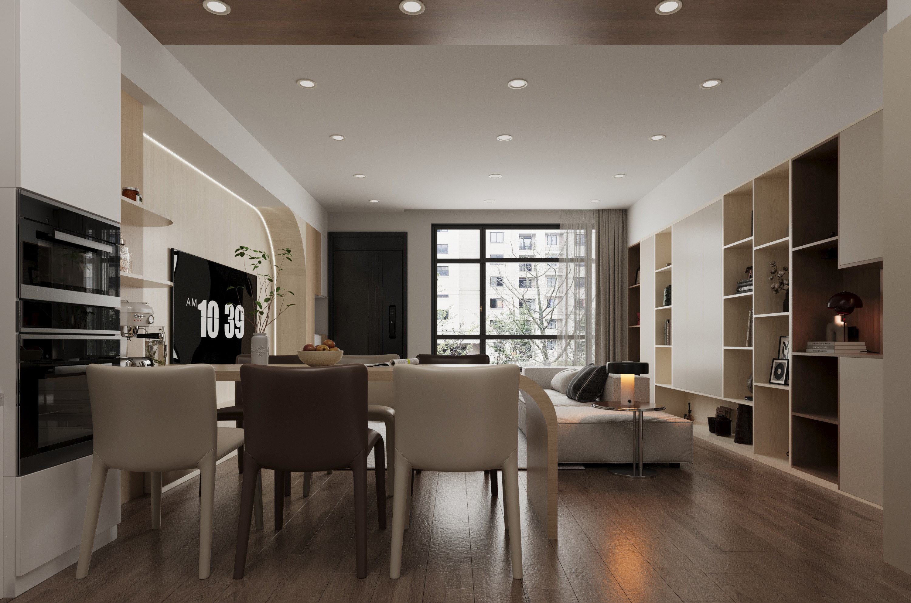 米色與原木色調交融,營造舒適溫暖的氛圍。大面積落地窗引入充足自然光,讓空間明亮通透。背景牆的開放式展示櫃與封閉系統櫃相結合,充分利用牆面空間,既可收納日常用品,保持整潔,亦可展示收藏品,增添層次與個性。白木紋系統櫃設計提升美感,與環境融為一體,封閉櫃體隱藏雜物,保持簡約實用。內部燈光設計增強視覺層次感,照亮擺設物品,使空間顯得更現代。