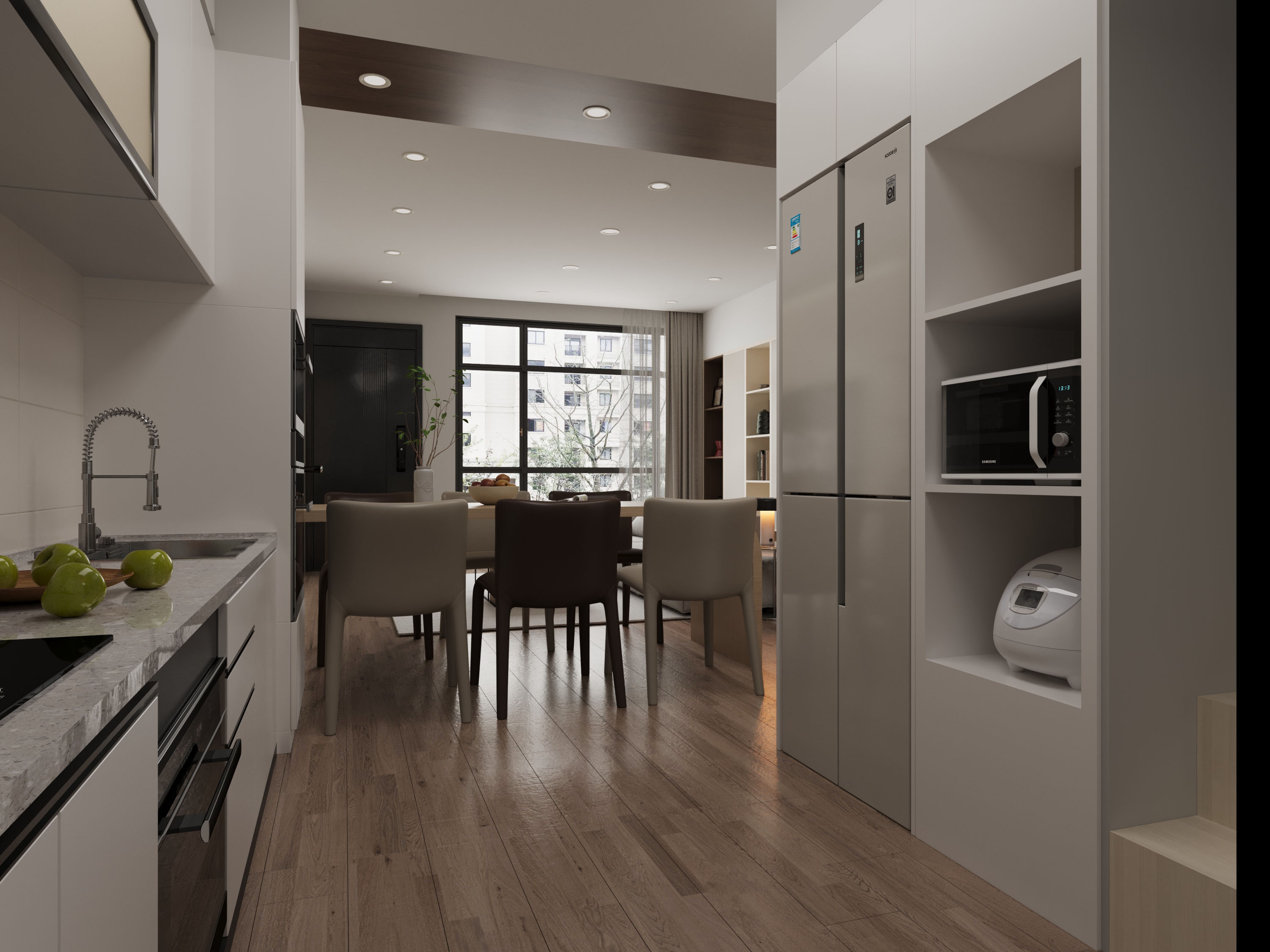 餐廳區域選用柔和中性色調餐椅,搭配木質餐桌,延續輕日式的自然風格。整體空間簡約大氣,實用美感兼具,營造放鬆愉悅的生活環境。