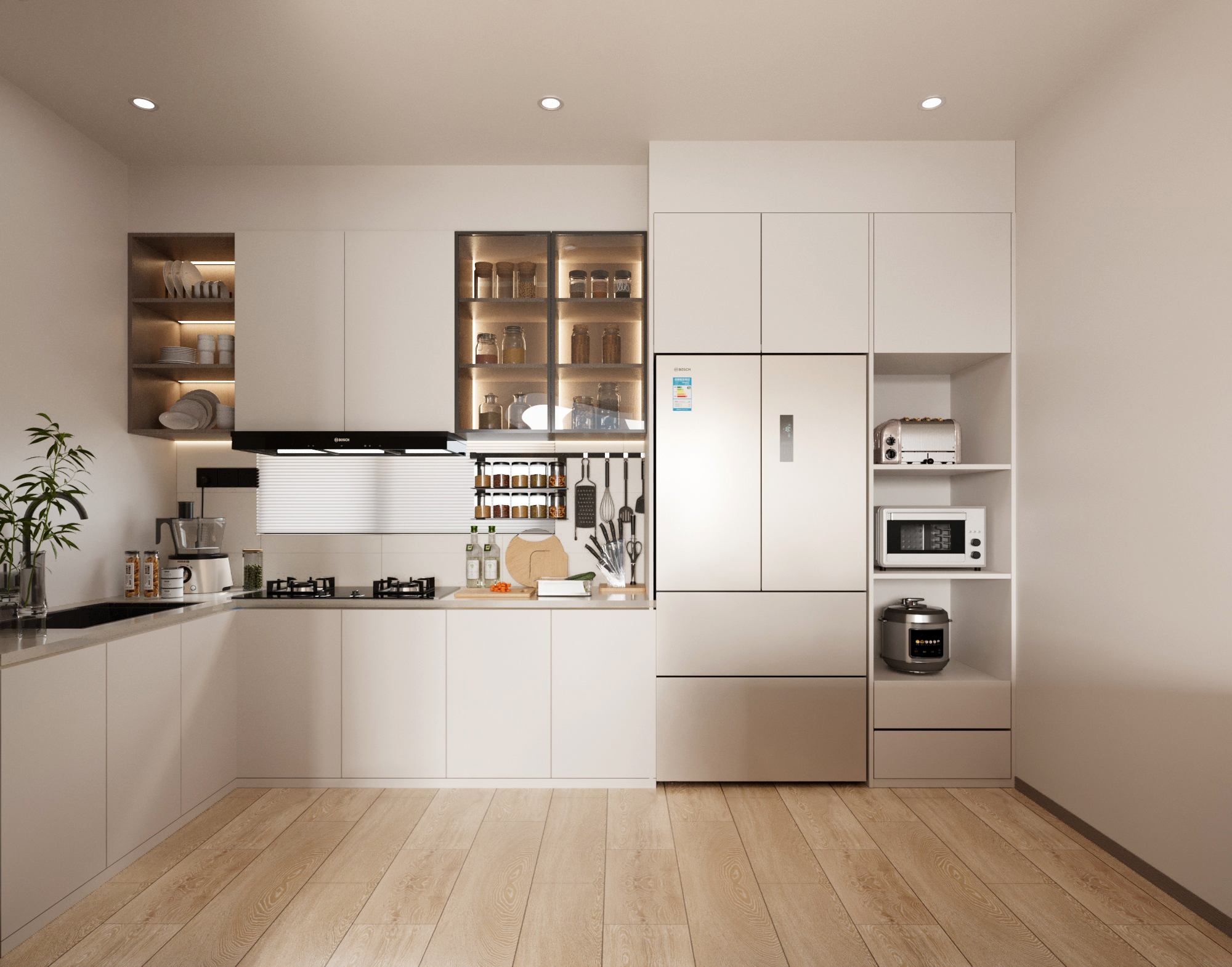原木材質地板為空間注入自然的溫暖,並搭配大理石紋理的中島台面,在材質運用上達到視覺的平衡。整體空間採用開放式動線設計,有效提升了空間流動感,而隱藏式收納櫥櫃則維持了整體的乾淨俐落感。低飽和度色彩搭配營造出一種和諧寧靜的氛圍,細節上則融入金屬吊燈與細框設計,增添現代質感。
