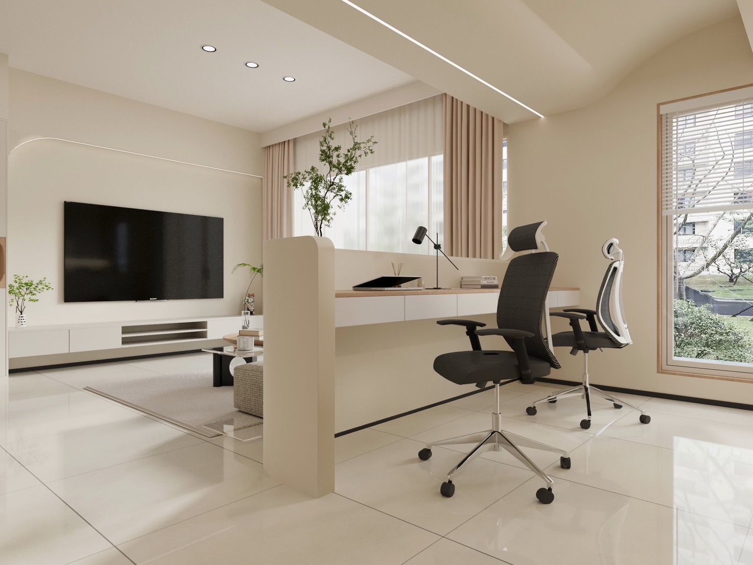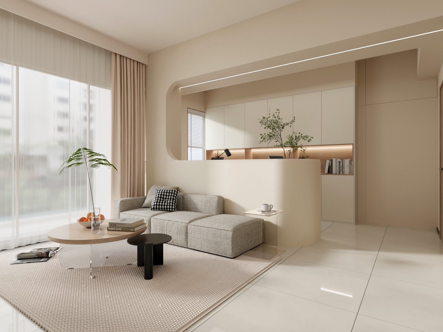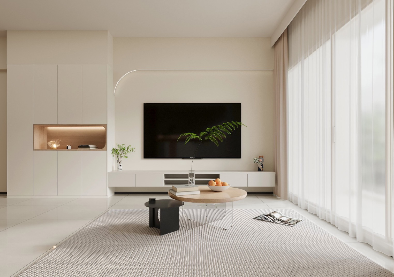 簡潔的白色牆面與溫潤的木質家具,搭配隱藏式光帶設計,提升了整體的溫馨感與精緻度。大片落地窗讓自然光自由灑入,強調空間的開放性與舒適性。電視牆上的內嵌展示櫃結合柔和的照明,賦予空間層次感與視覺焦點。整體設計追求簡約而實用,展現出一種平和自然的生活態度。