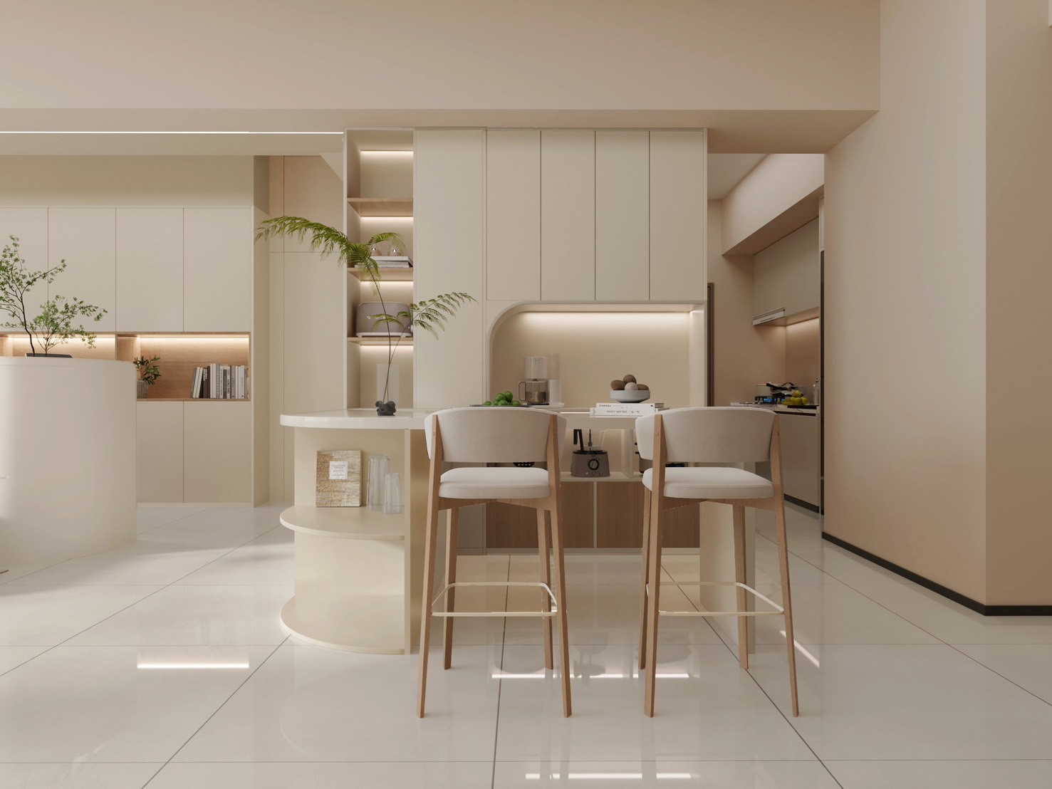 牆面與櫥櫃採用柔和的淺色調,使空間更顯明亮寬敞。餐桌以簡潔的曲線和木質材質為主,突顯出設計的質感與自然氣息。