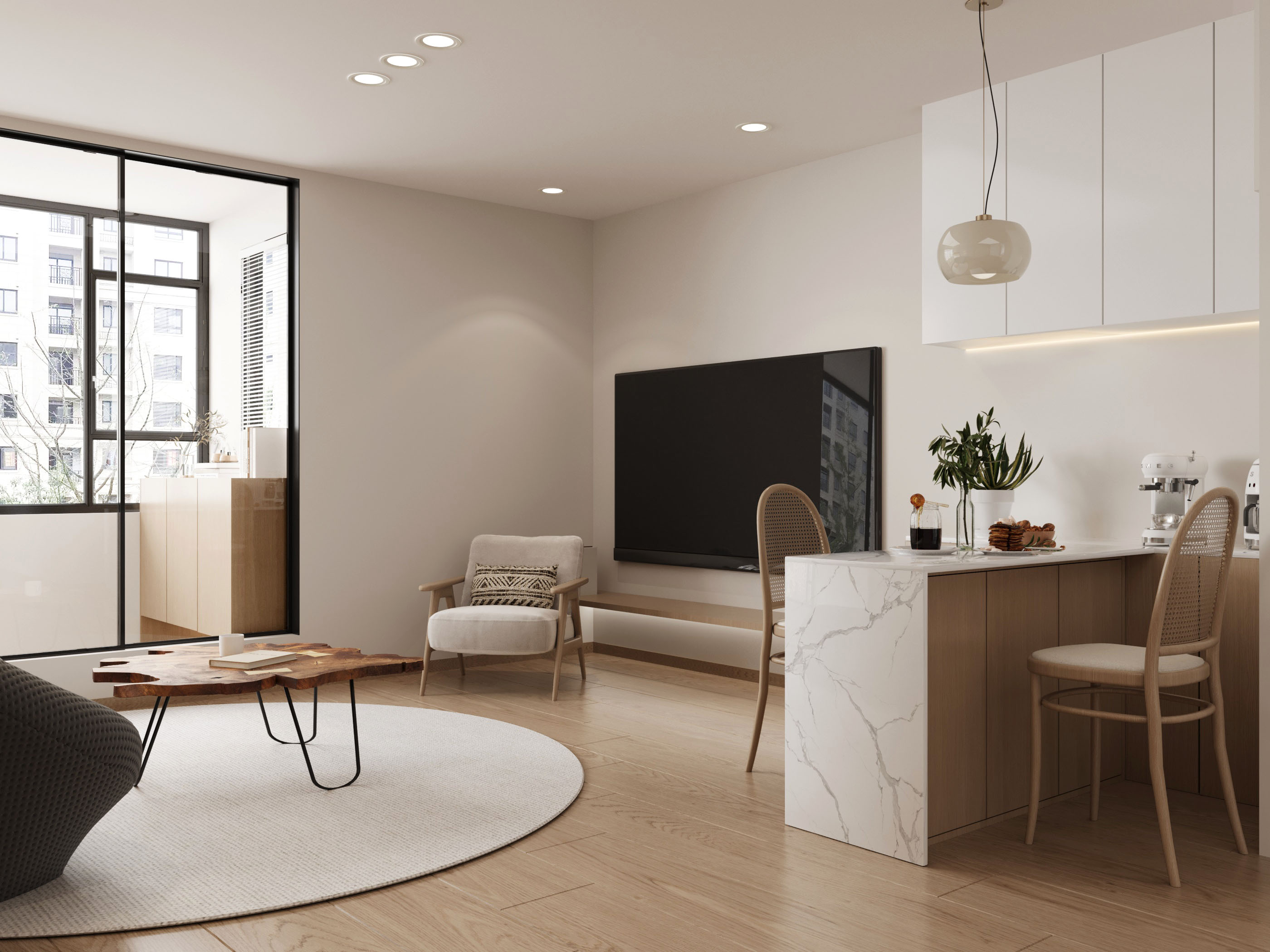 客廳以現代極簡風結合日系無印風為主軸,打造出一個開闊而純粹的空間。大面積的落地窗引入自然光,木質地板與柔和的淺色系家具營造出溫暖而放鬆的氛圍。空間中,隱藏式收納與簡潔線條設計使得視覺效果清爽利落,讓整體格局顯得更為通透。極簡主義摒棄了繁複的裝飾,以少即是多的理念,營造出一種平靜而不失溫度的氛圍。