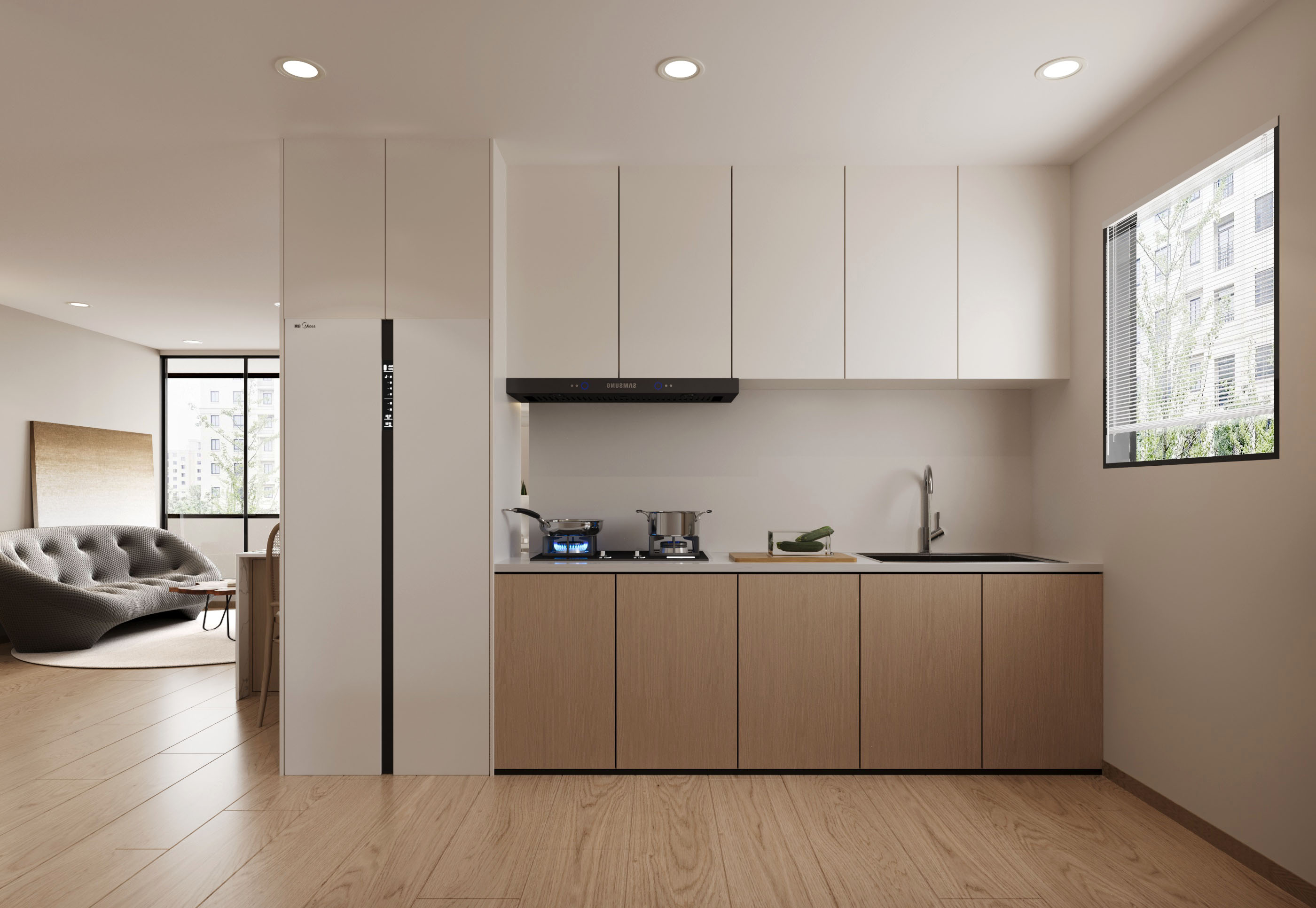 以淺木色櫥櫃搭配純白牆面,整體色調簡約而溫潤,營造出清新明亮的視覺感受。開放式空間設計增強了廚房的通透感,讓料理與生活的互動更加流暢。隱藏式收納設計巧妙地將日常用品有序收納,維持了整體空間的整潔與簡約。無把手櫥櫃與流線型設計,使得廚房在視覺上呈現一種低調而洗鍊的美感。
