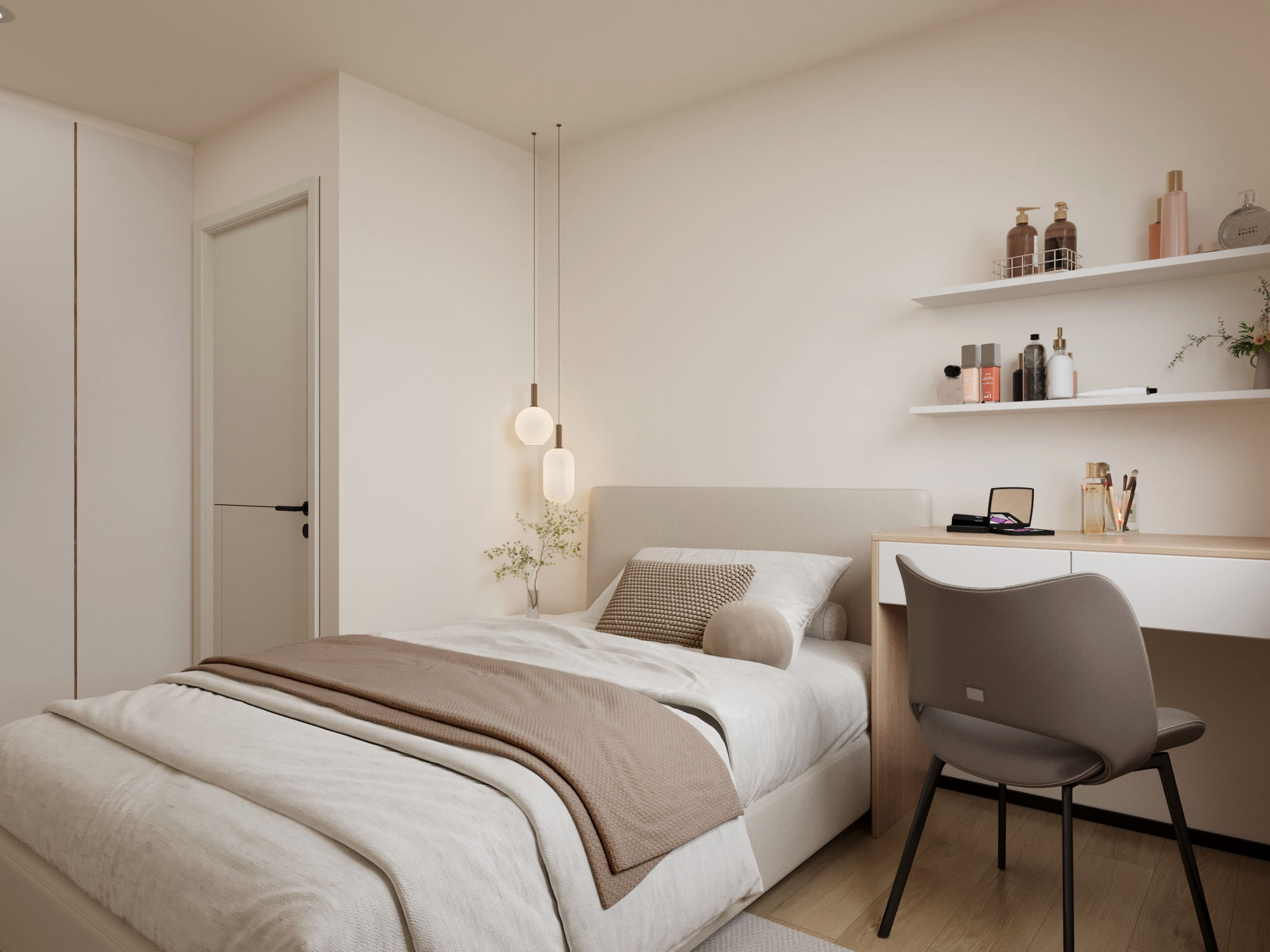 柔和的淺色調與木質元素的運用,帶來溫馨而純淨的視覺體驗。簡潔的線條設計與低彩度的牆面,凸顯出空間的清爽感,讓居住者得以放鬆身心。床邊的小吊燈散發柔和光芒,與開放式的收納架形成了優雅的功能性搭配。隱藏式衣櫃巧妙地融入整體設計,實現了收納與美感的平衡。