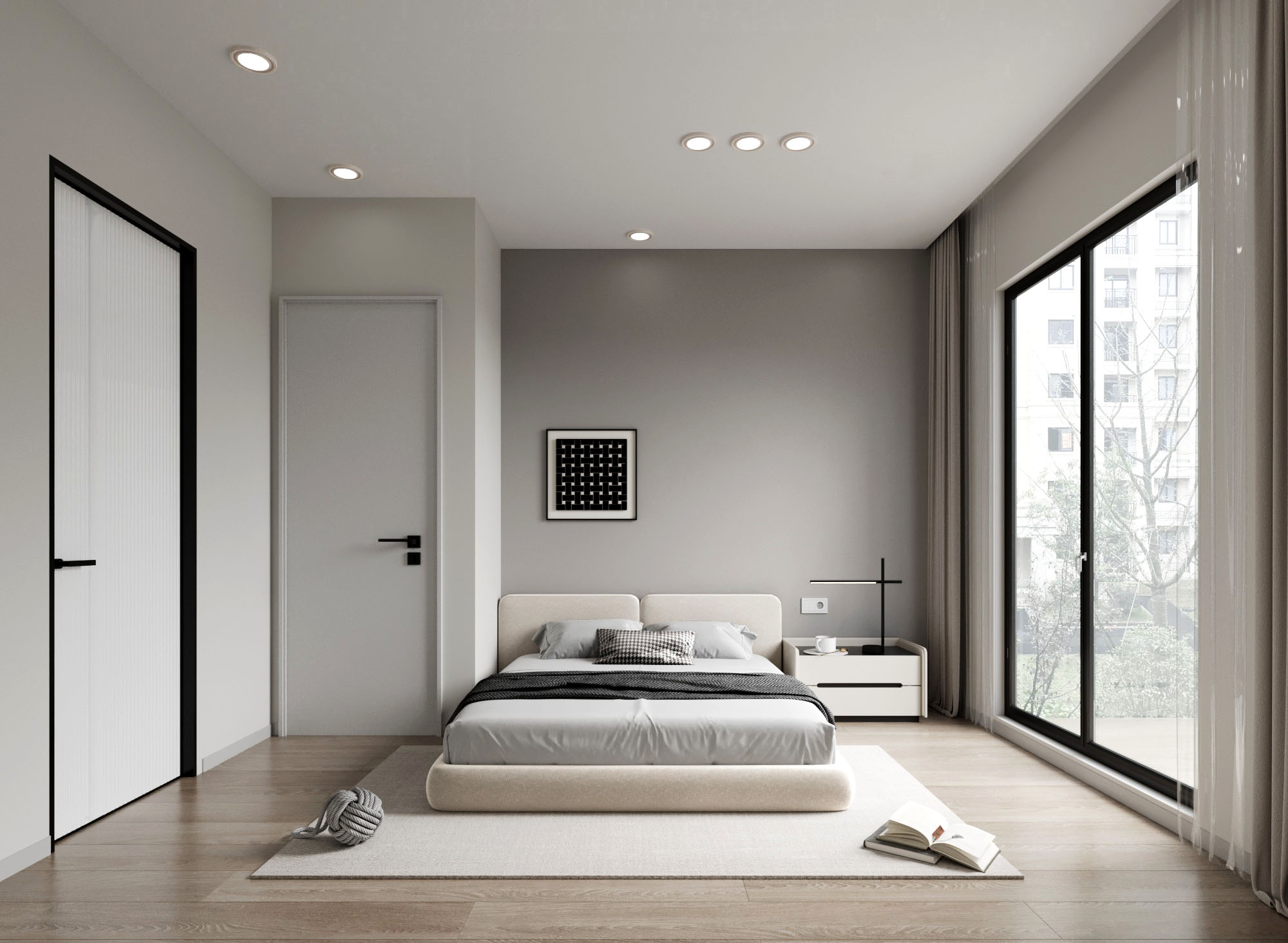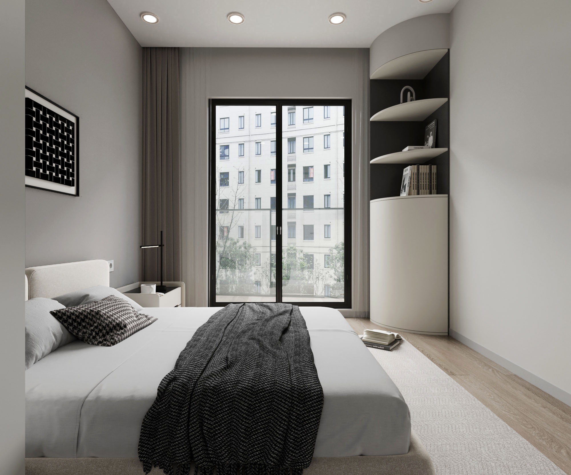 以現代風格的簡約線條為基調,強調空間感與舒適氛圍的營造。牆面以柔和的中性色調作為主視覺,搭配簡潔的床具與俐落的幾何形邊桌,展現出視覺上的乾淨俐落。靠窗設計引入大量自然光源,使房間充滿溫暖而柔和的光影變化,突顯空間的通透性。牆角的弧形收納架結合功能性與美學設計,創造了更具秩序的空間規劃。