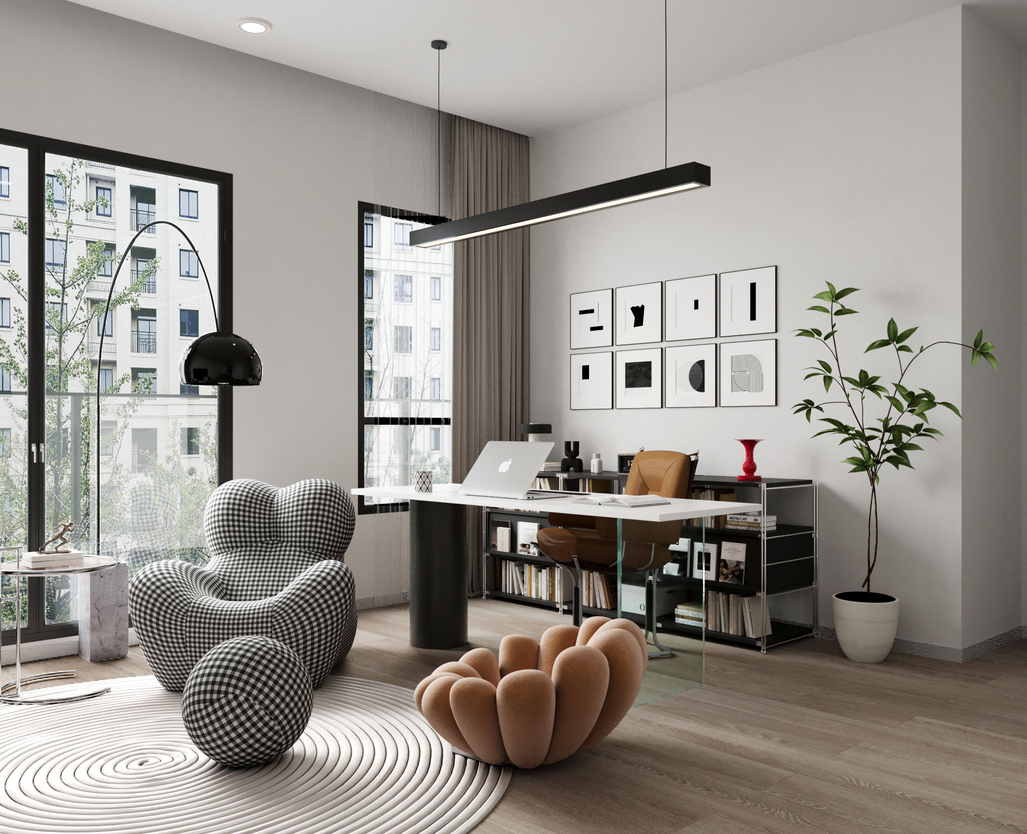 以現代風格展現簡約的格調與大方的美感。採用開放式的佈局,讓視野更加開闊,同時利用落地窗引入自然光線,勾勒出通透明亮的氛圍。選用極具設計感的沙發與線條俐落的家具,搭配溫潤的木質地板,讓空間在理性與溫馨間取得平衡。牆上簡約的幾何藝術裝飾,為空間增添了一絲藝術感,低調卻不失格調。
