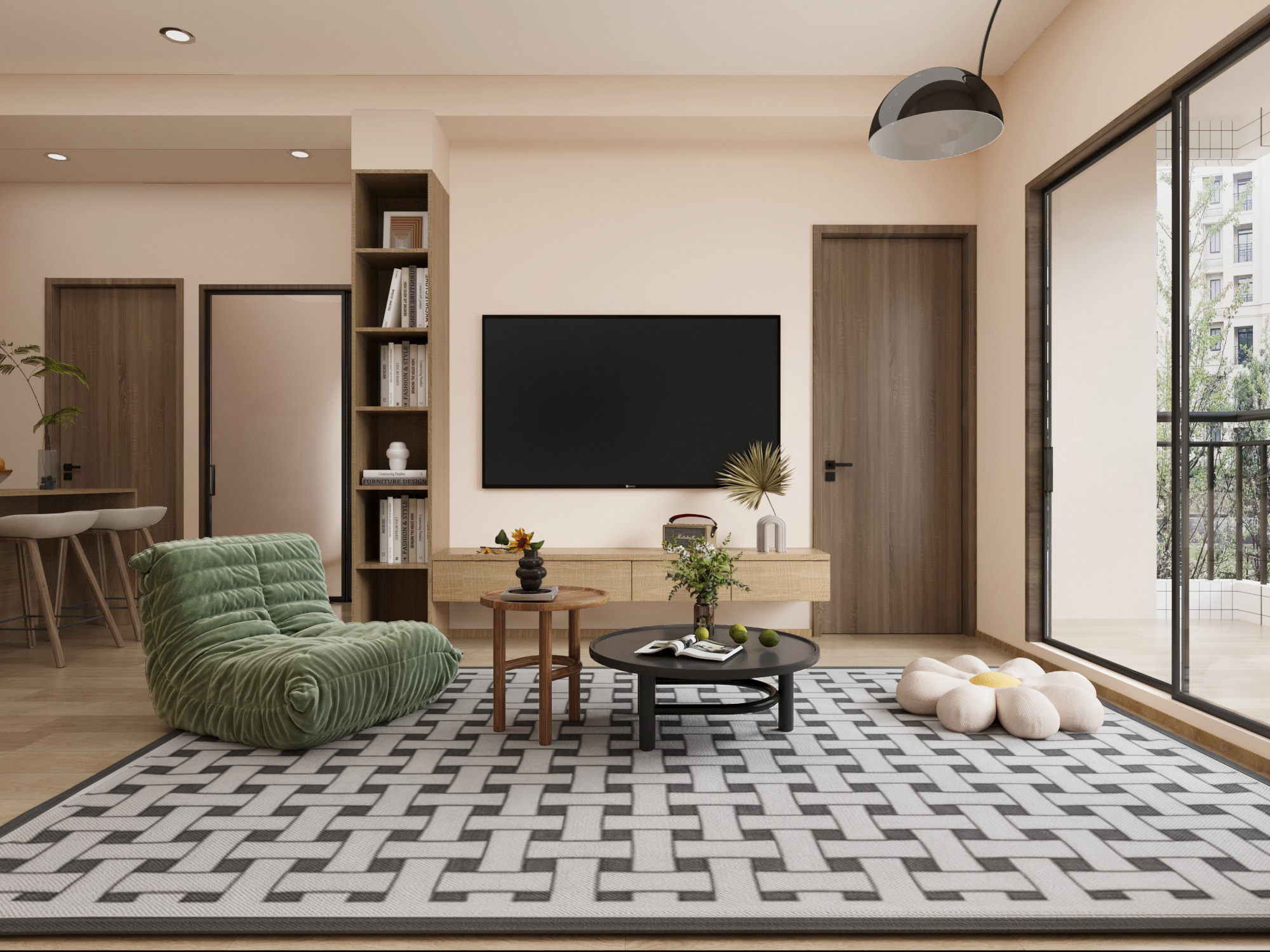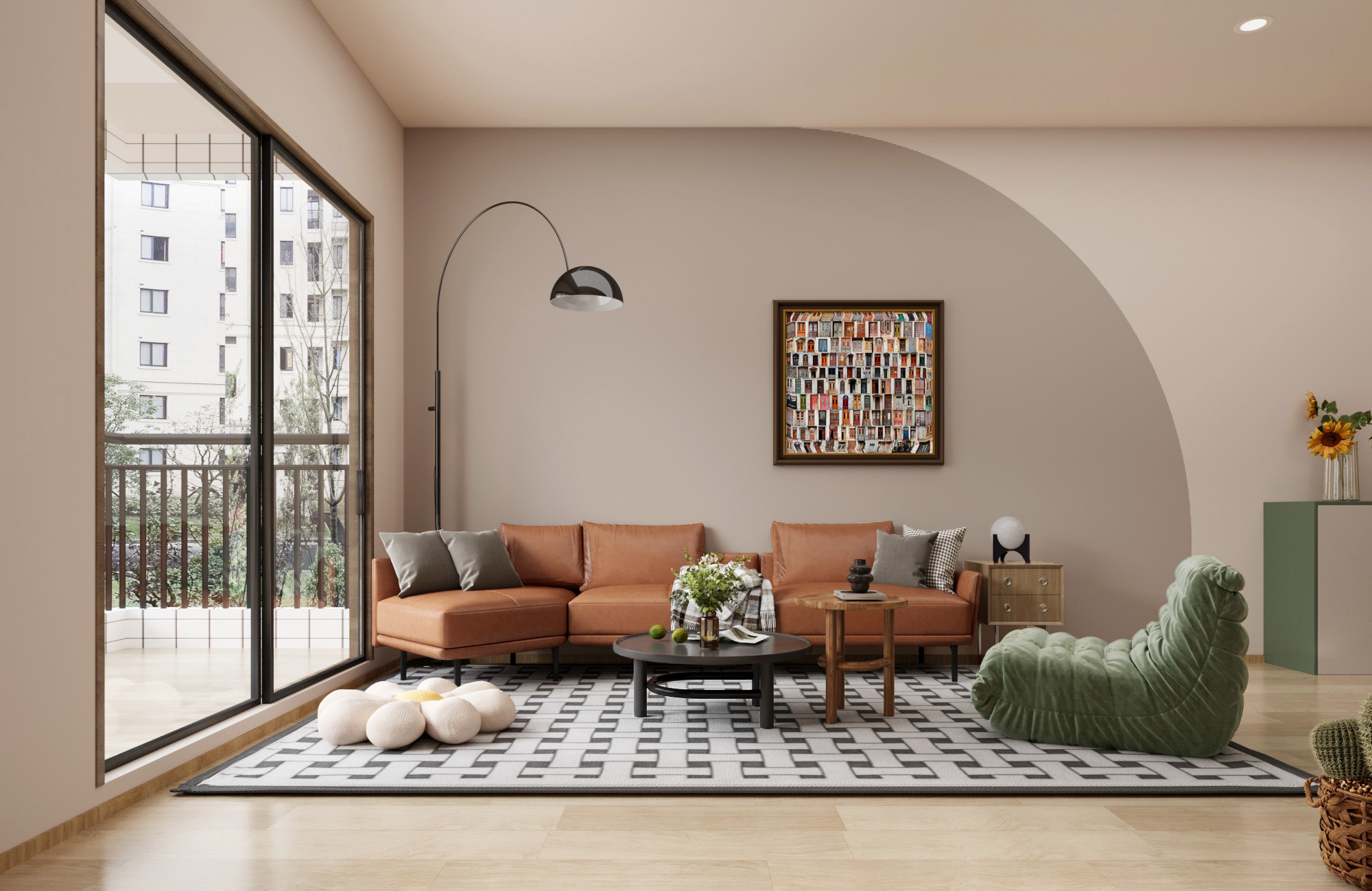 陽光透過大面落地窗傾灑而入,為空間注入自然氣息,木質地板的溫潤質感與家具的現代簡約線條相得益彰。幾何圖案地毯與柔軟綠植椅巧妙平衡了視覺的冷暖,橙棕色沙發則點綴出沉穩與溫馨的生活氛圍。