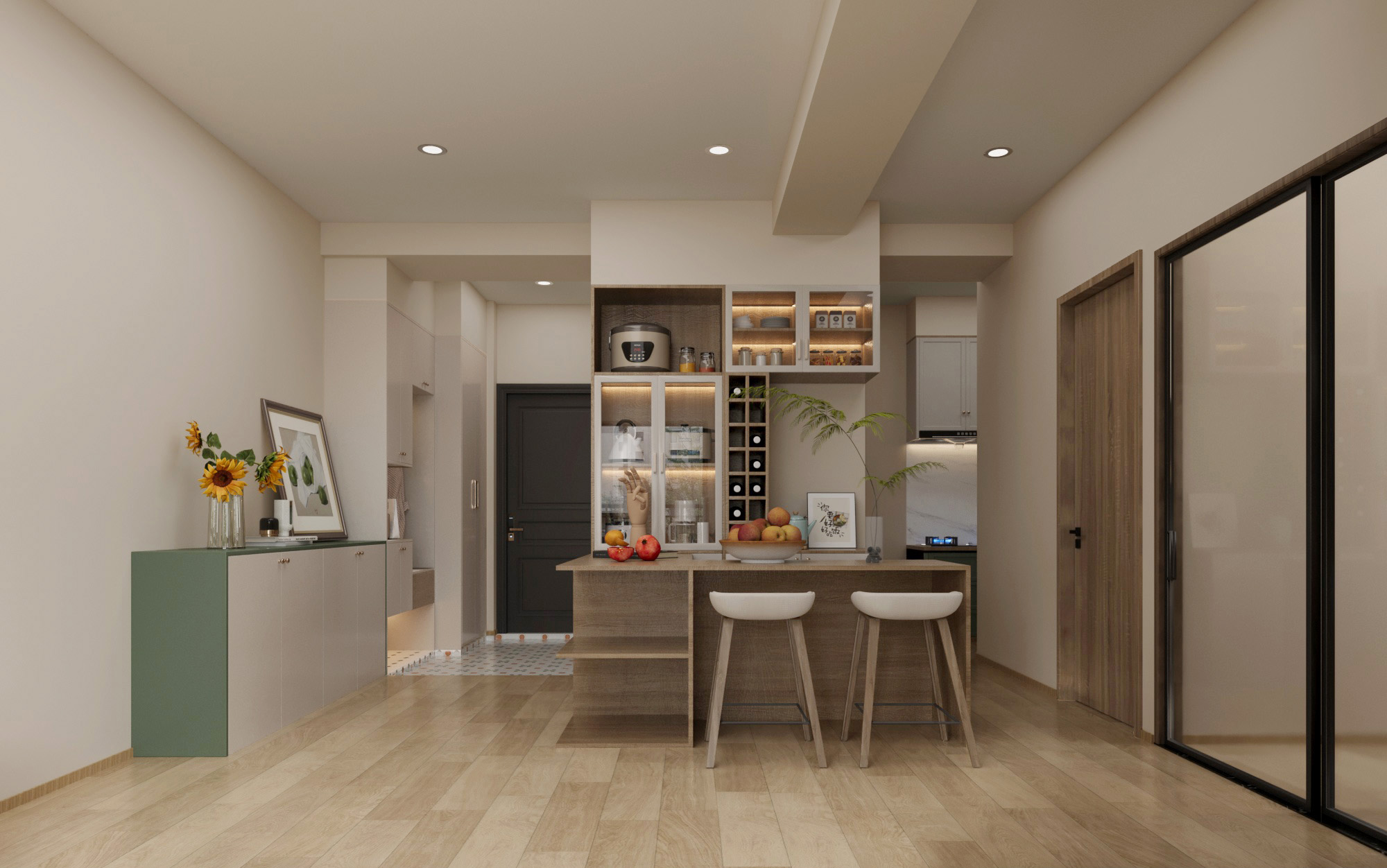 吧台椅的簡約線條與櫥櫃的自然質感相呼應,營造出輕鬆的生活氛圍。整體色調和諧,將現代極簡與溫馨格調融為一體,成就了一處實用又充滿設計感的生活場域。