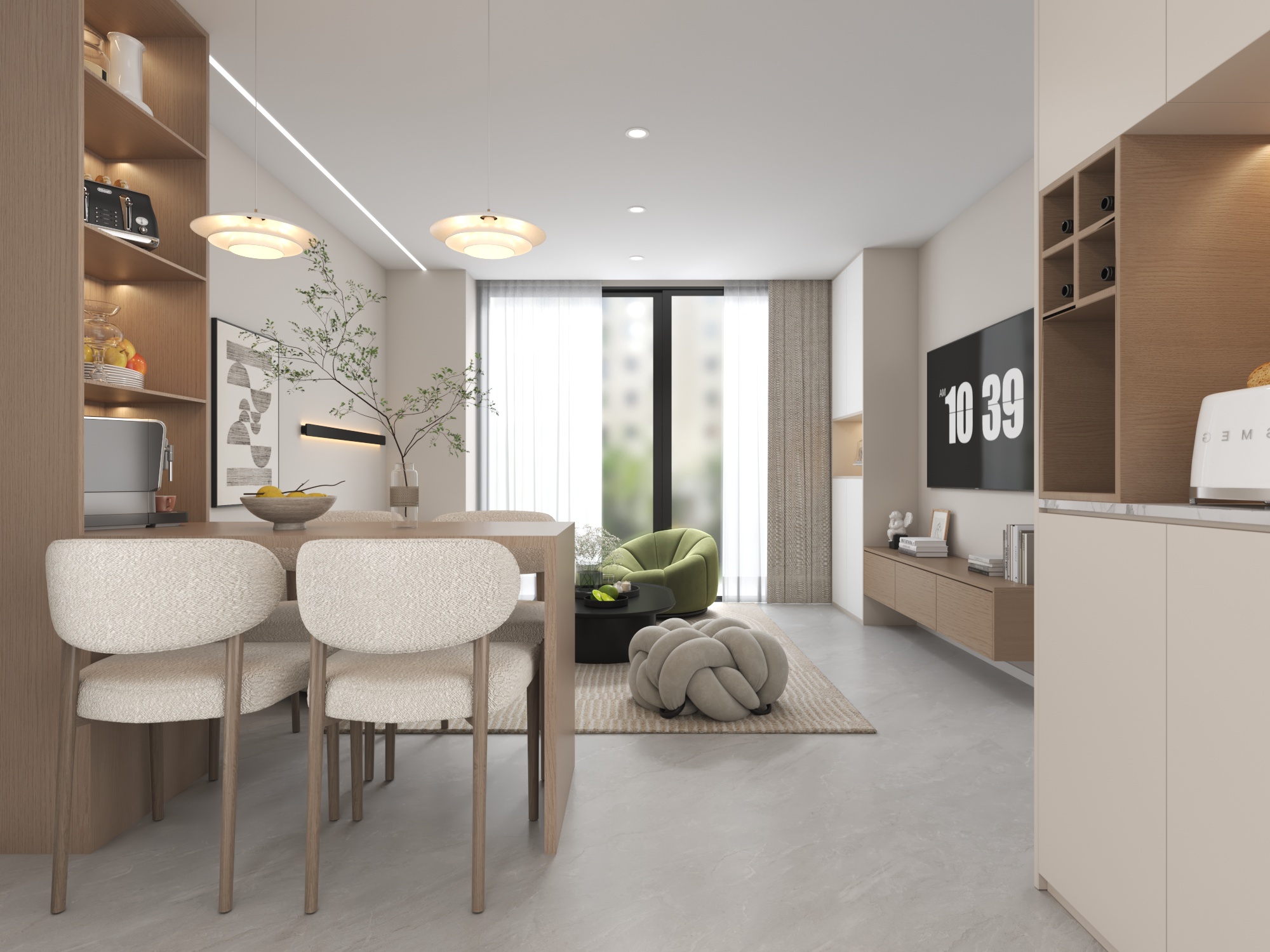 以簡約優雅為核心,透過溫潤木質與米白色座椅的搭配,營造出輕鬆而富有親和力的用餐氛圍。整體空間以柔和的燈光設計為點綴,兩盞吊燈垂墜於餐桌上方,勾勒出溫馨的聚餐場景。靠牆設置的展示層架巧妙結合收納與裝飾功能,擺放的器皿與綠植增添了空間的生氣與格調。